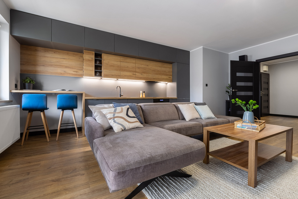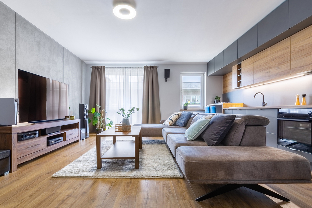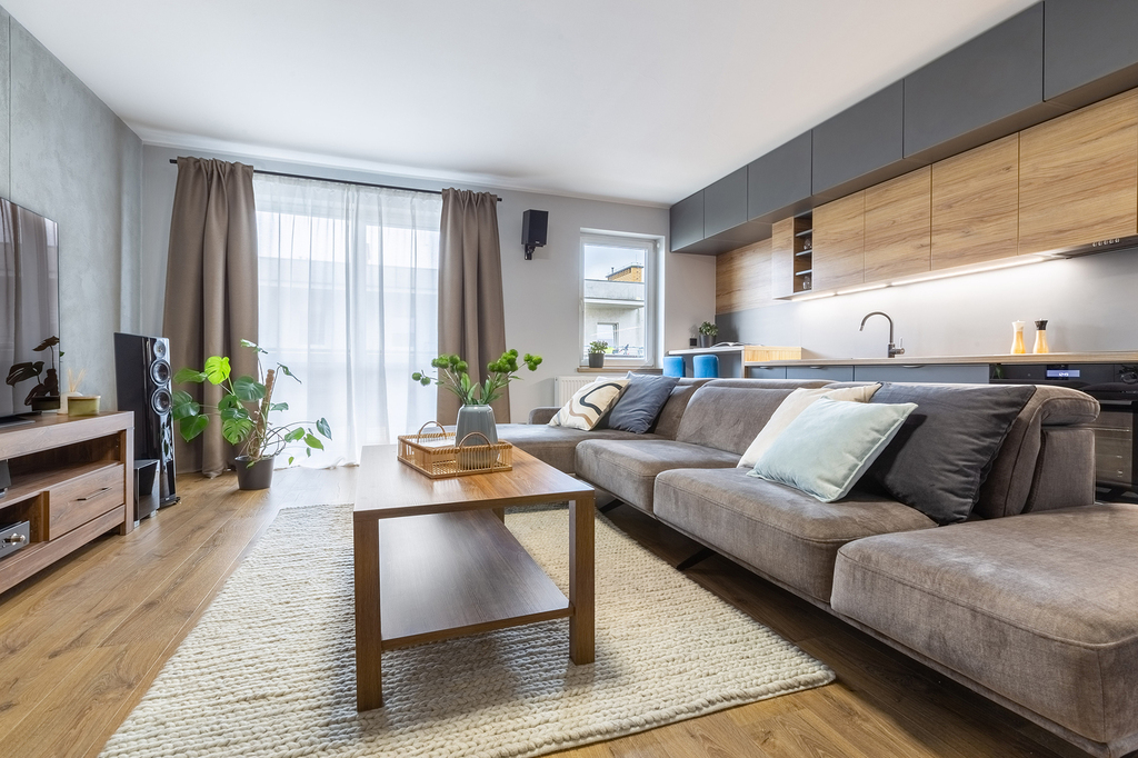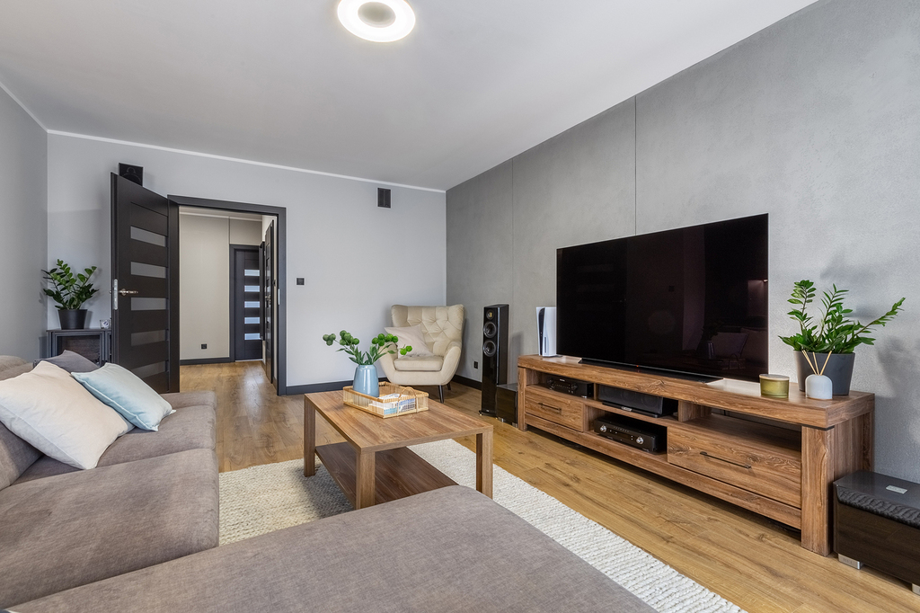 Mieszkanie urządzone w wysokim standardzie. Oświetlenie inteligentne Philips, podłoga wysokiej jakości QuickStep , narożnik w salonie ma pół roku , zakupiony za kwotę 8500 zł .