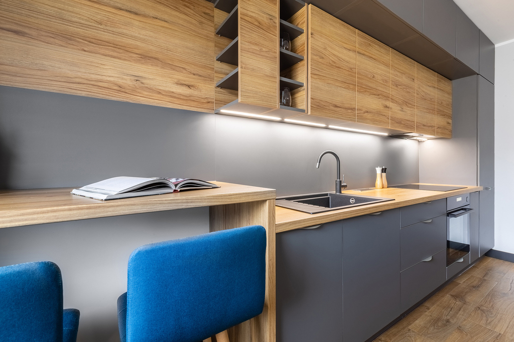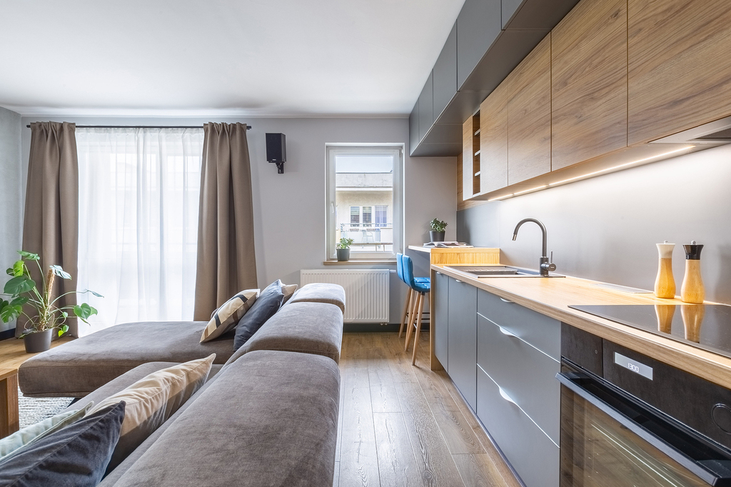 – salon z aneksem kuchennym ( umeblowany z wyjściem na sporą loggię z ekspozycją na południowym zachód , kuchnia otwarta zabudowana meblami na wymiar z markowym sprzętem AGD – piekarnik, zmywarka, lodówka, płyta indukcyjna, okap ) )