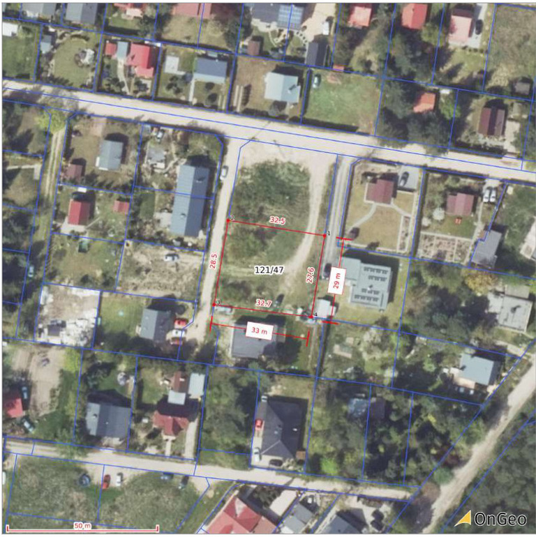 – Obręb: 0010, numer działki: 121/47. Powierzchnia: 916 m².