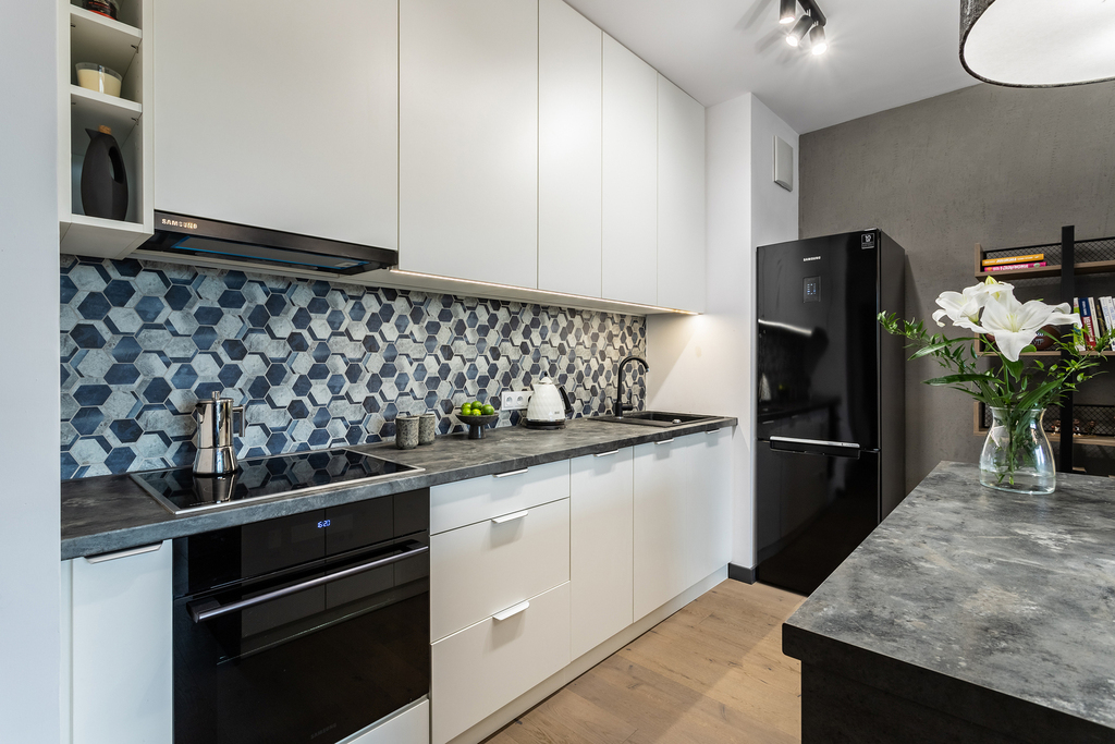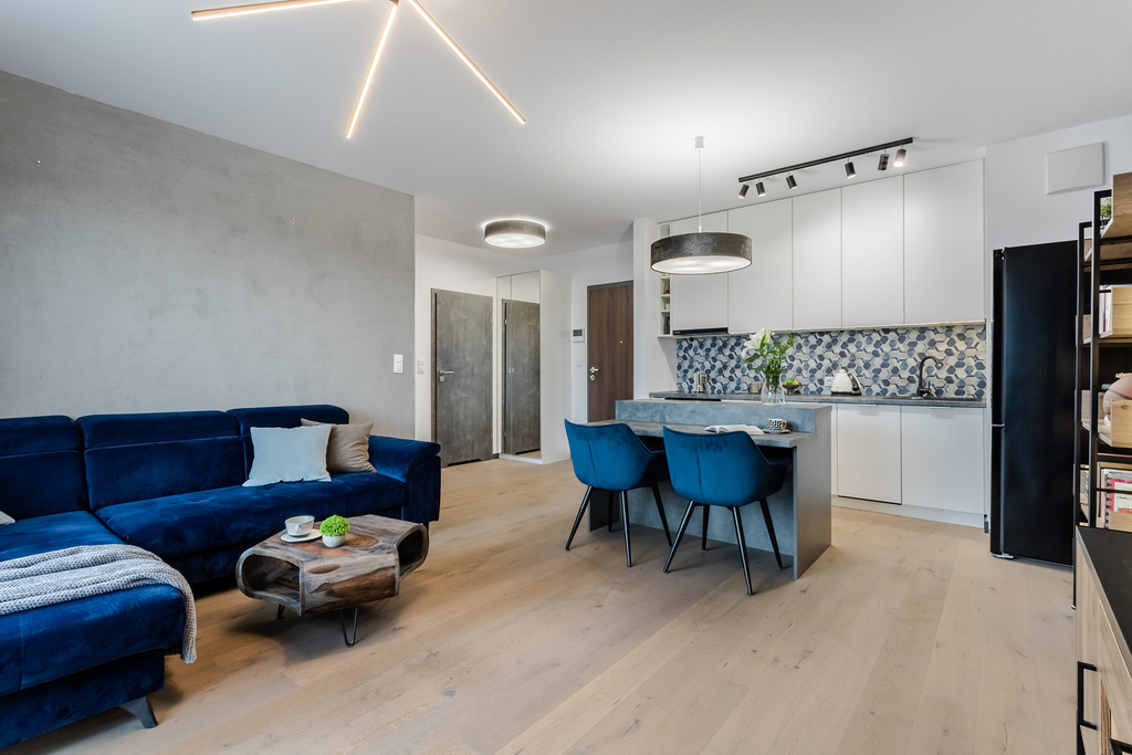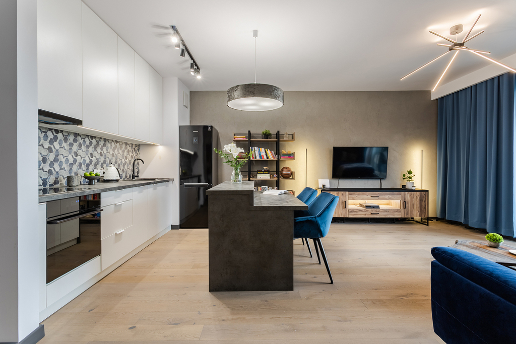 Mieszkanie zaprojektowane przez architekta z wykorzystaniem wysokiej jakości materiałów ( drewno dąb na podłodze , hiszpański gres w łazience , wszystkie sprzęty AGD marki Samsung – lodówka, płyta grzewcza, zmywarka, piekarnik, pralko-suszarka , cała kuchnia robiona na wymiar przez stolarza )