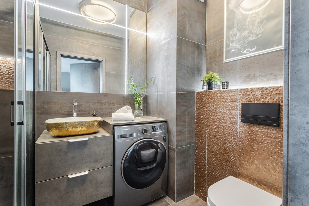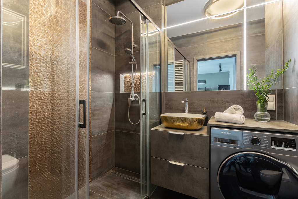 – łazienki z pralką, umywalką, WC oraz dużym prysznicem typu walk-in