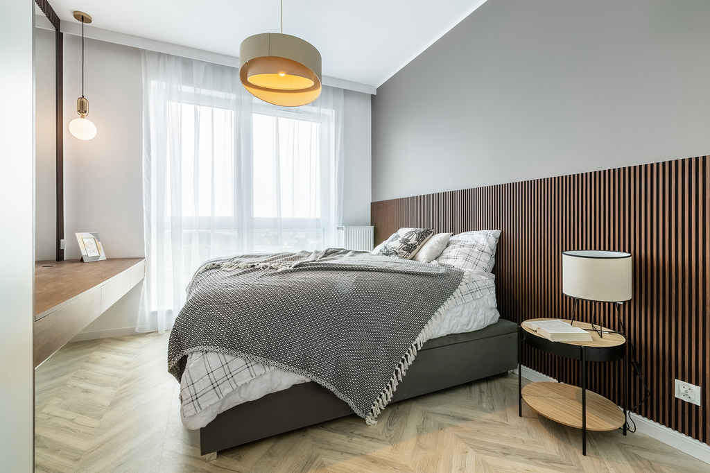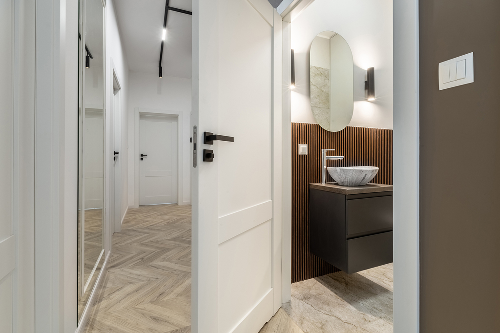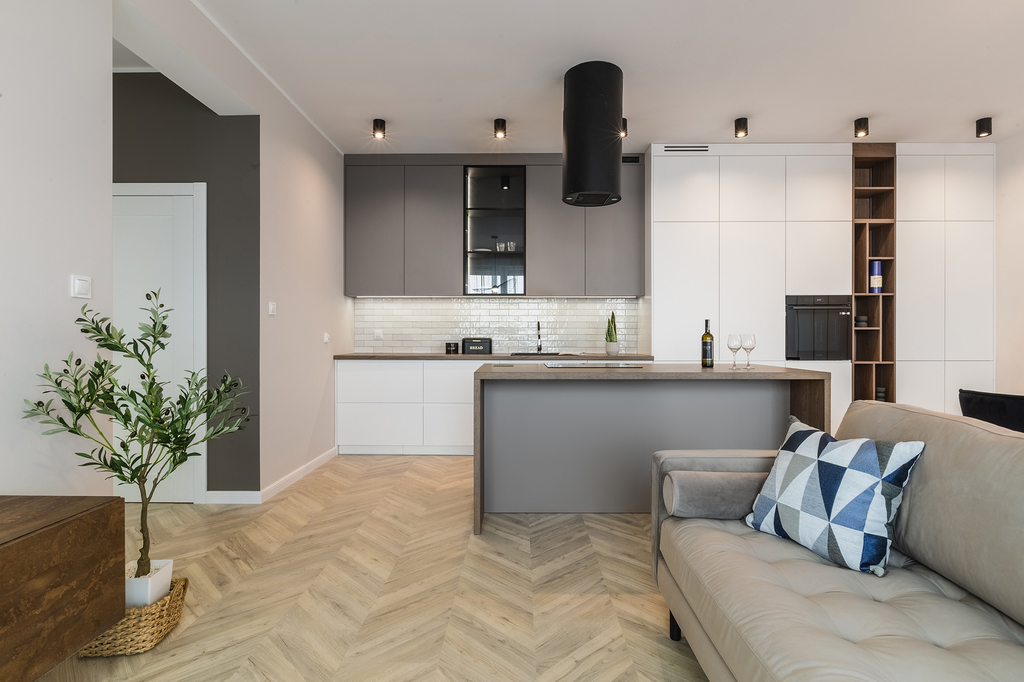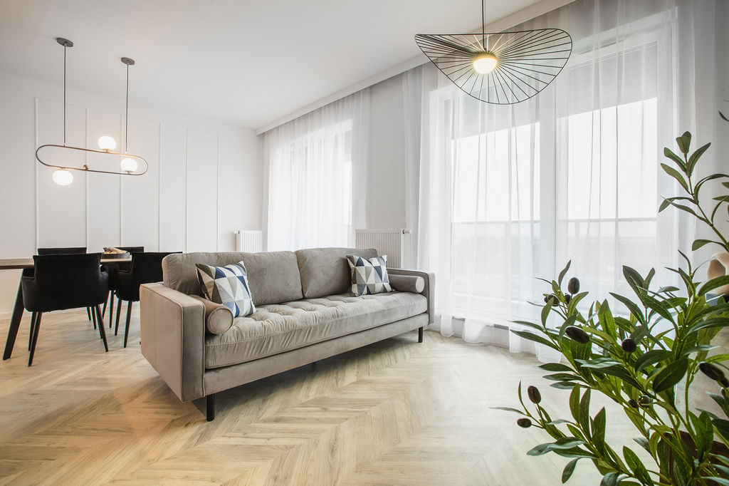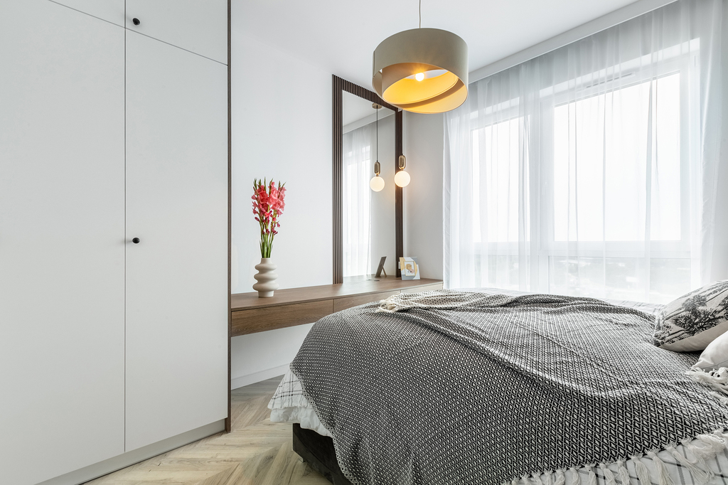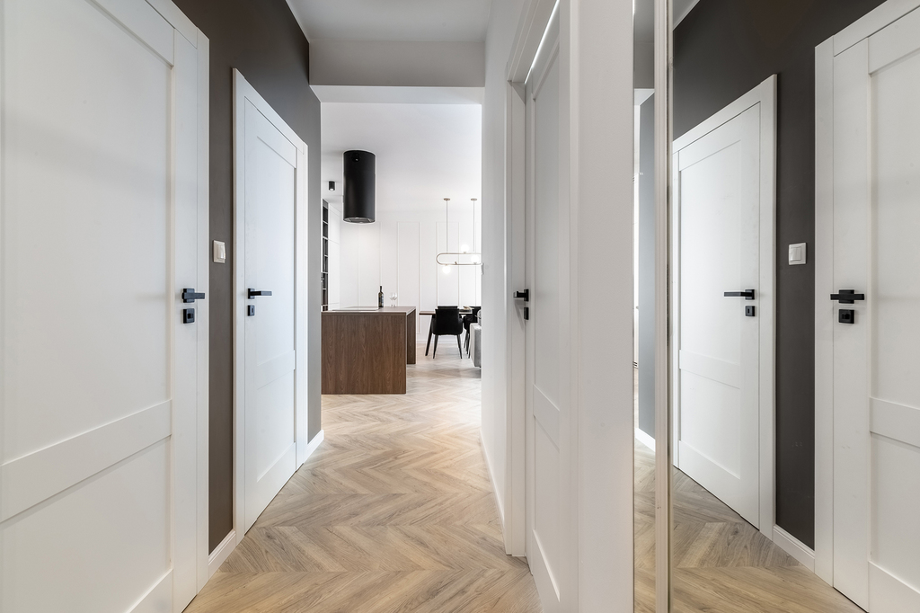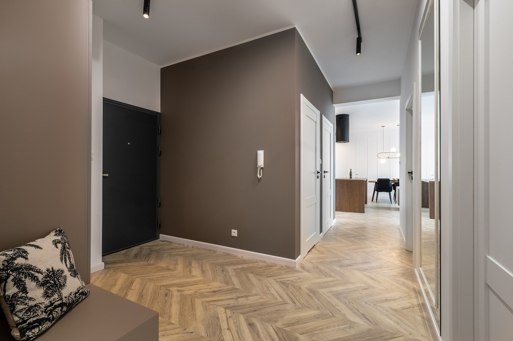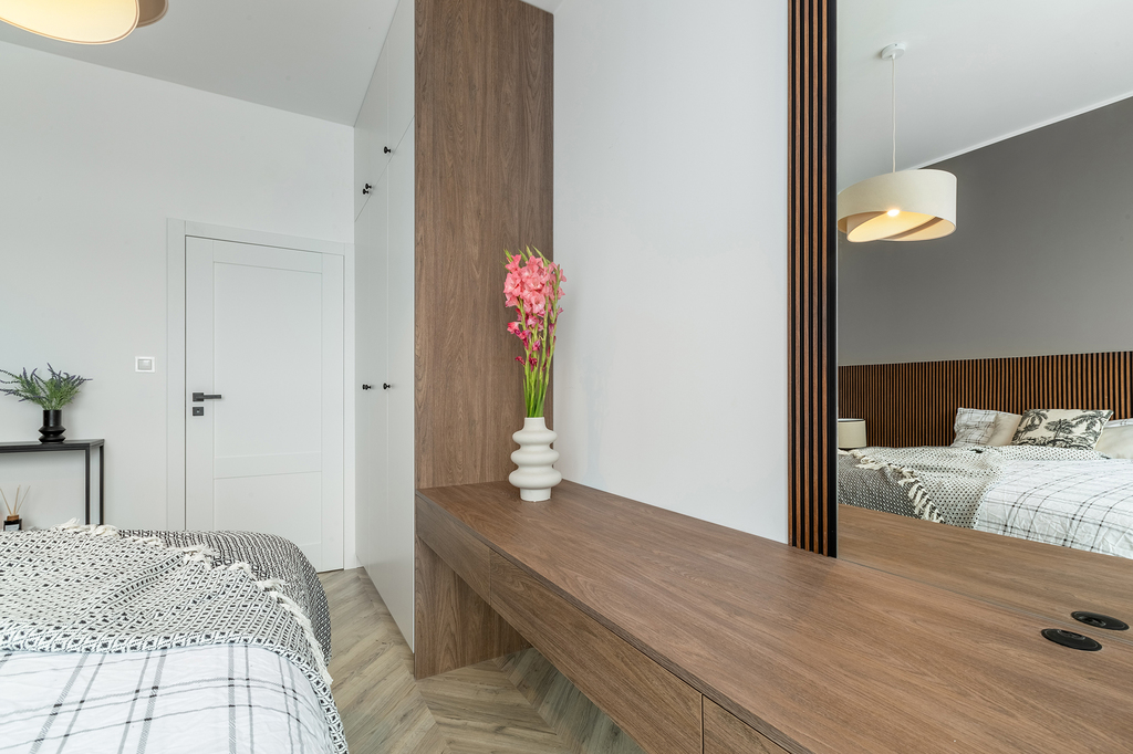 Apartament został zaprojektowany przez projektanta z myślą o zagospodarowaniu każdej wolnej przestrzeni, stąd do dyspozycji mają Państwo mnóstwo mebli w zabudowie, które idealnie komponują się z układem mieszkania.