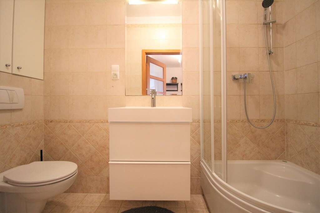 – łazienka ( 4,4 m2 ) z prysznicem, pralką oraz WC