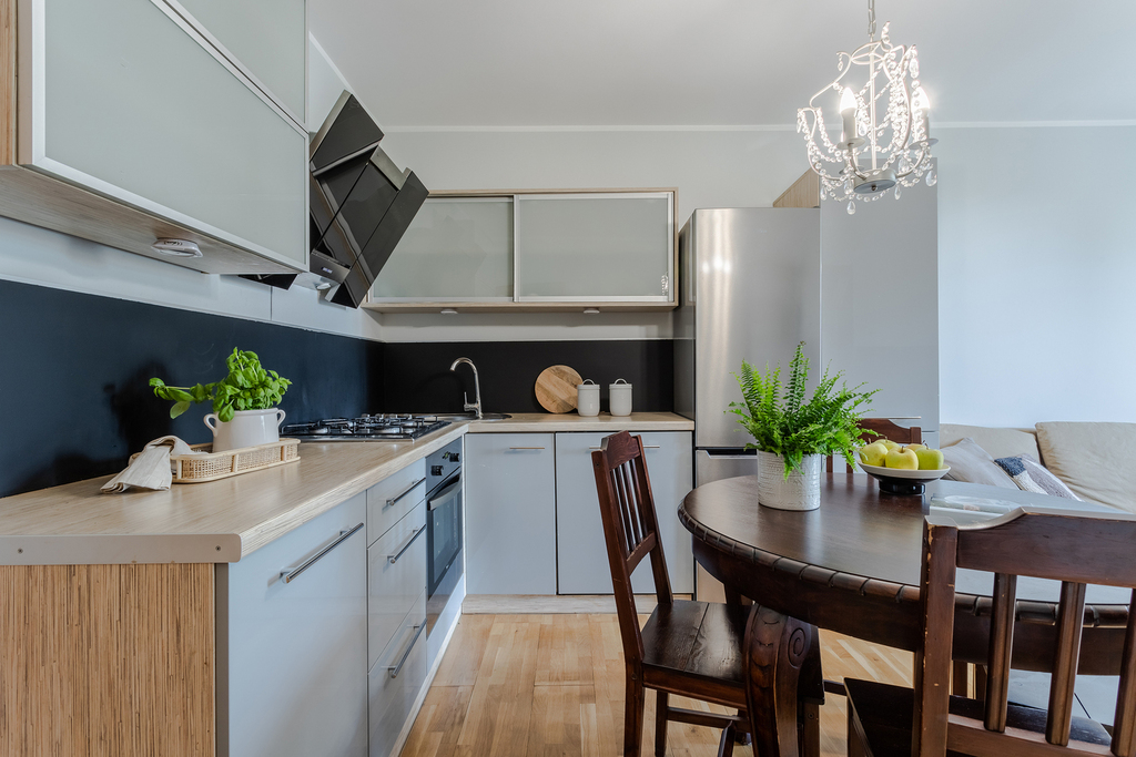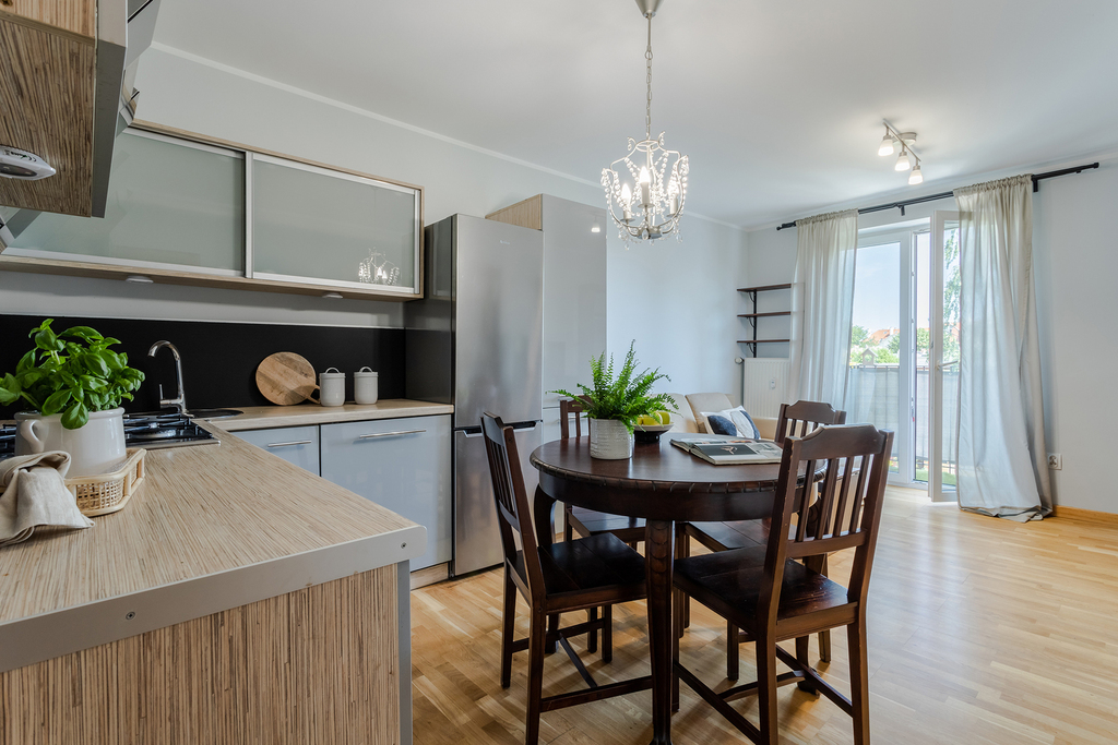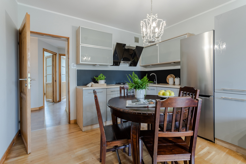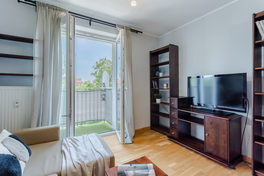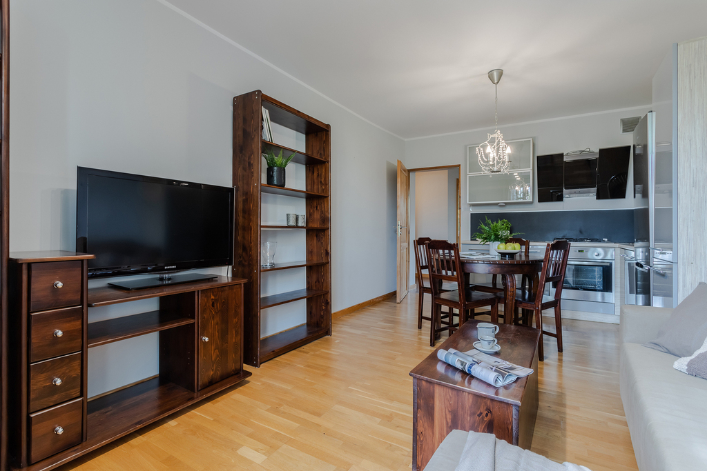 – salon z aneksem kuchennym ( wyposażony w meble na wymiar , zmywarkę, okap, kuchenkę na gaz, lodówkę ) oraz wyjściem na balkon od strony ulicy Dmowskiego.