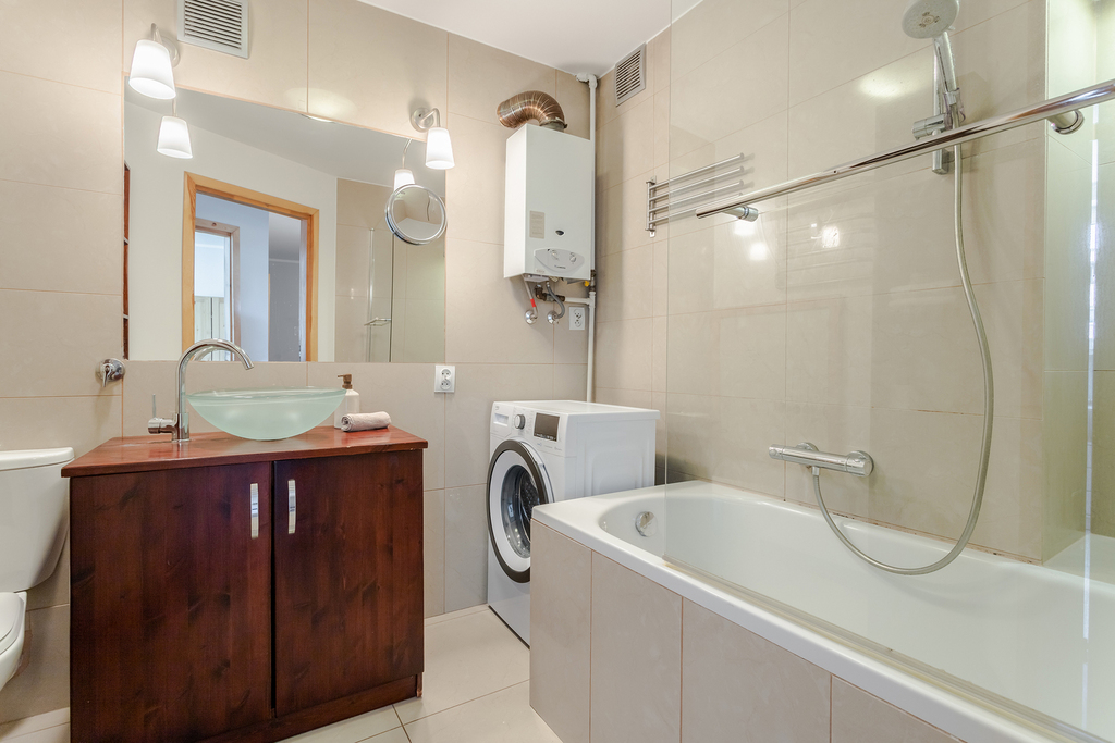 – łazienka z wanną/prysznicem , pralką, toaletą, umywalką oraz piecem do podgrzewania wody.