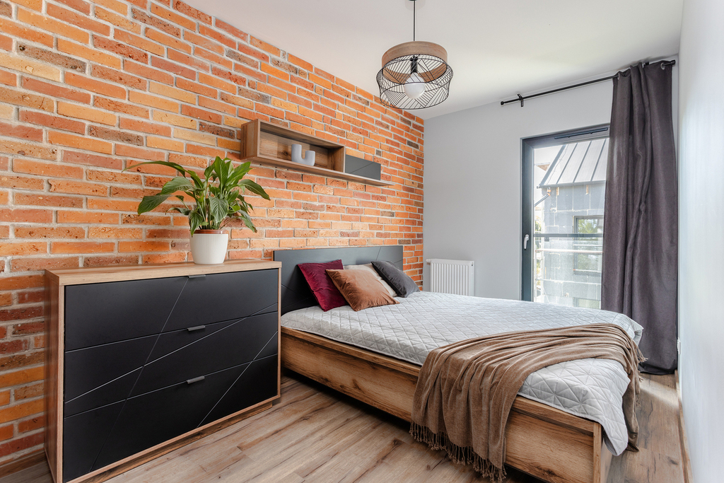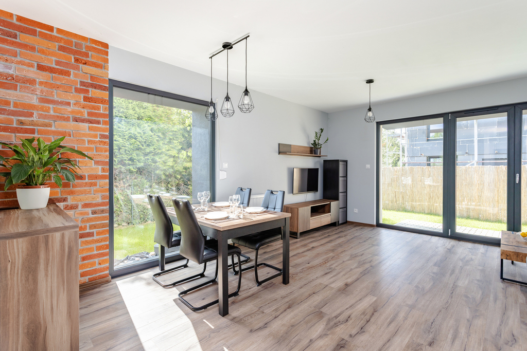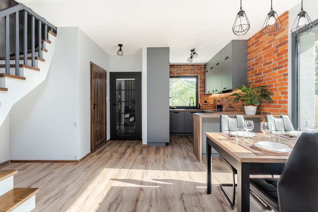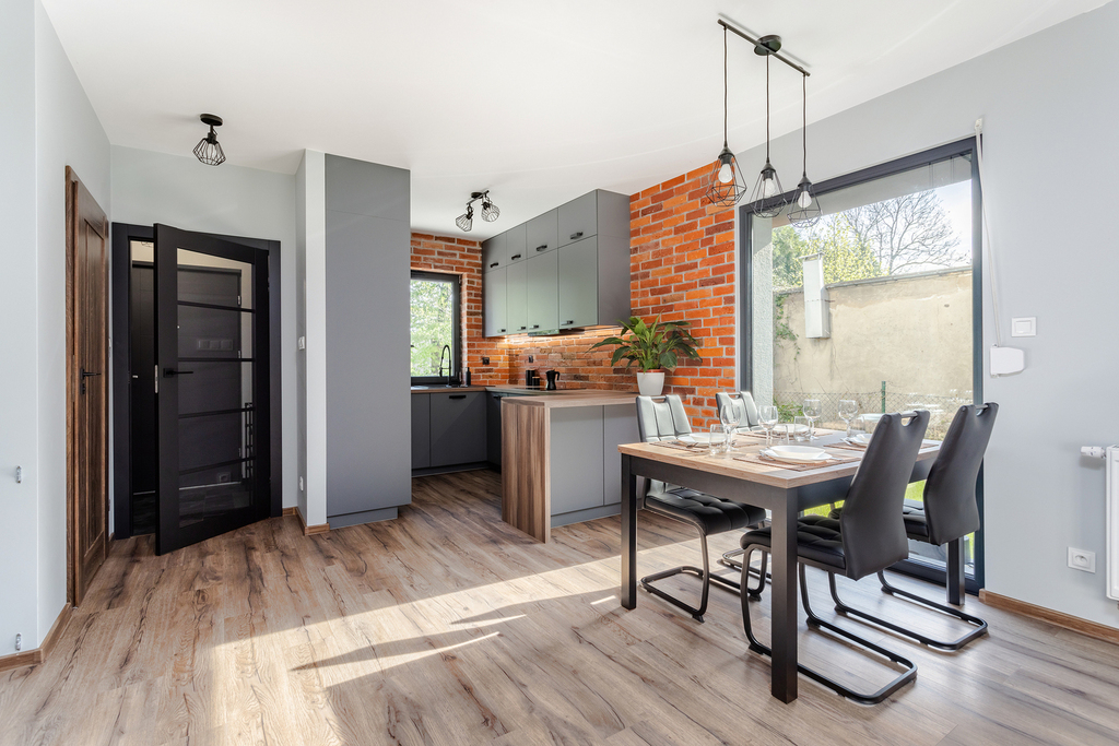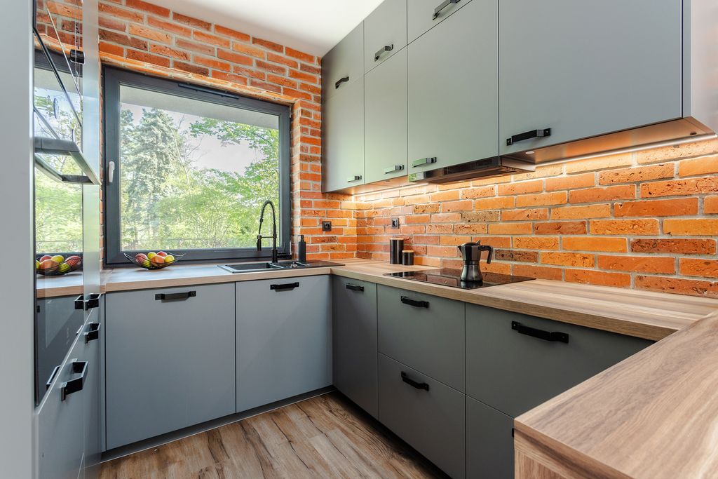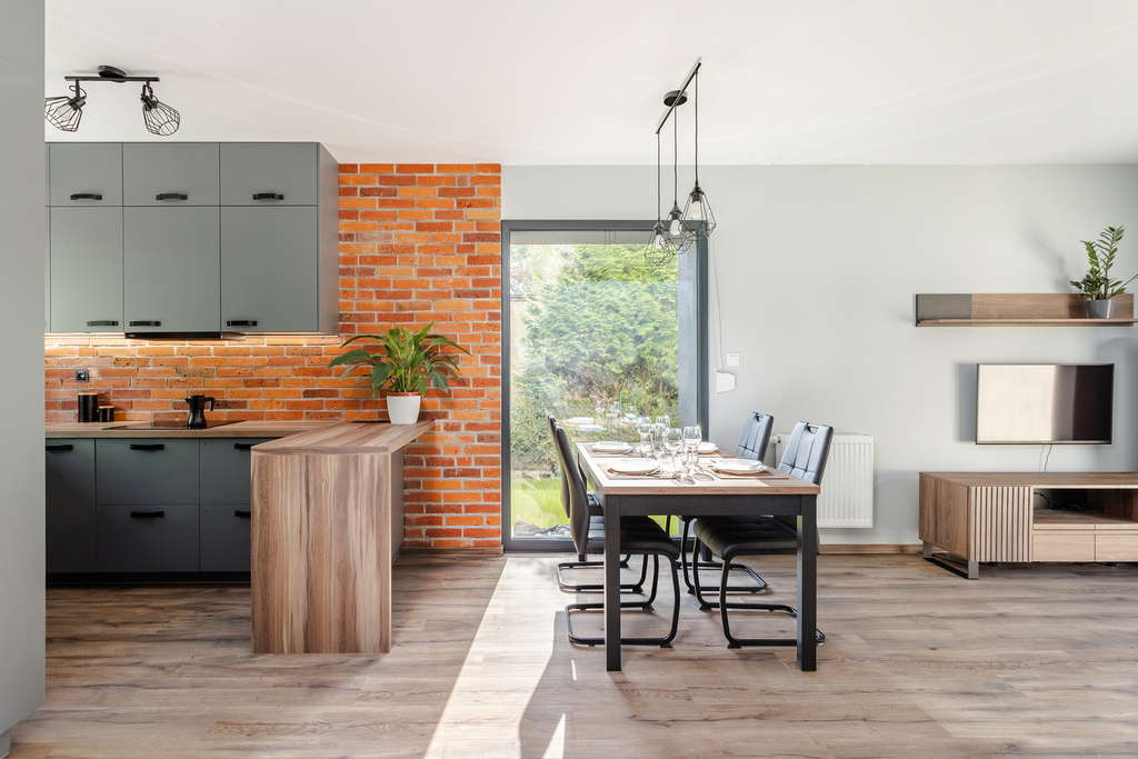 – Otwarta, nowoczesna kuchnia z naturalną cegłą na ścianach o powierzchni 4,70 m²