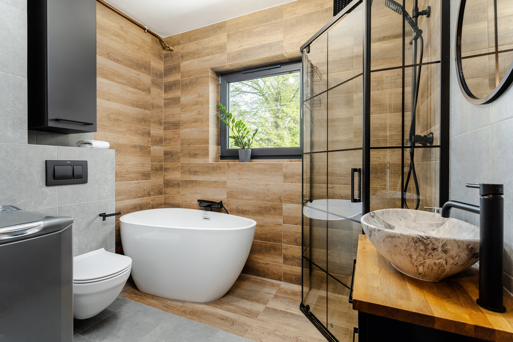 – Nowoczesna łazienka z wolnostojącą wanną, prysznicem z odpływem liniowym oraz dębowym blatem o powierzchni 4,95 m²