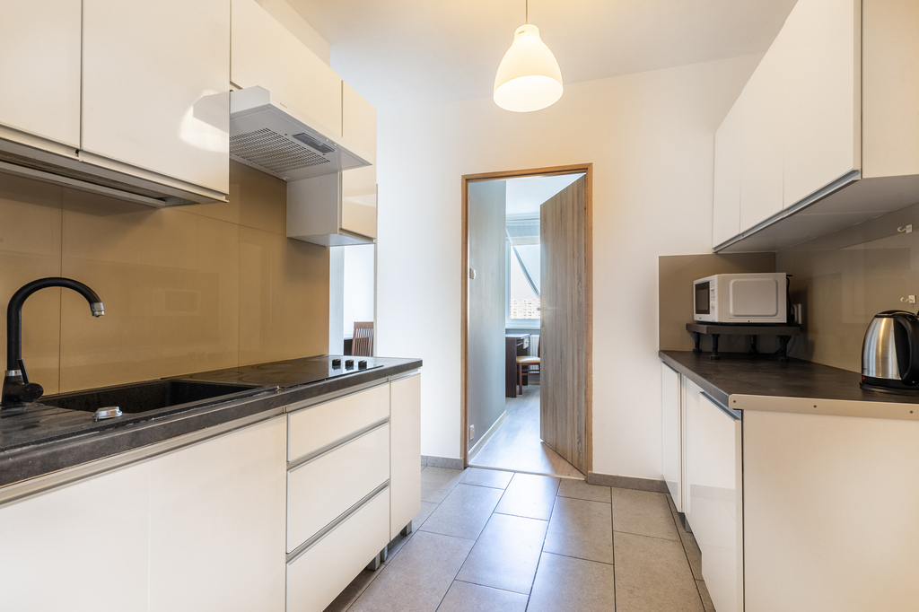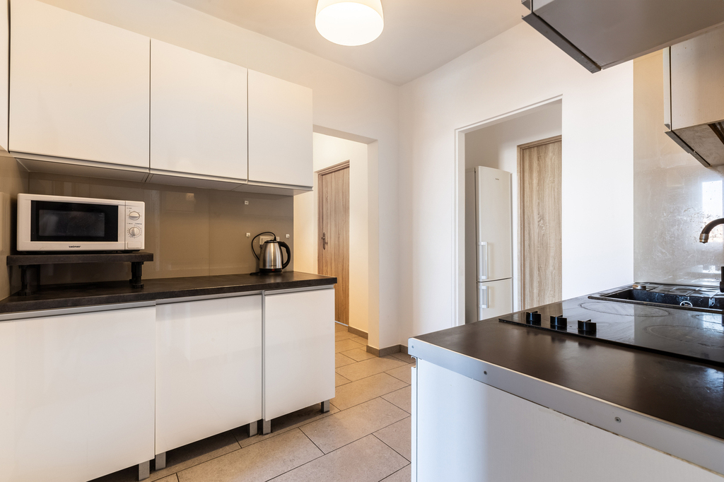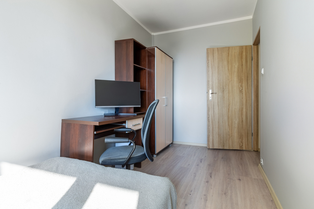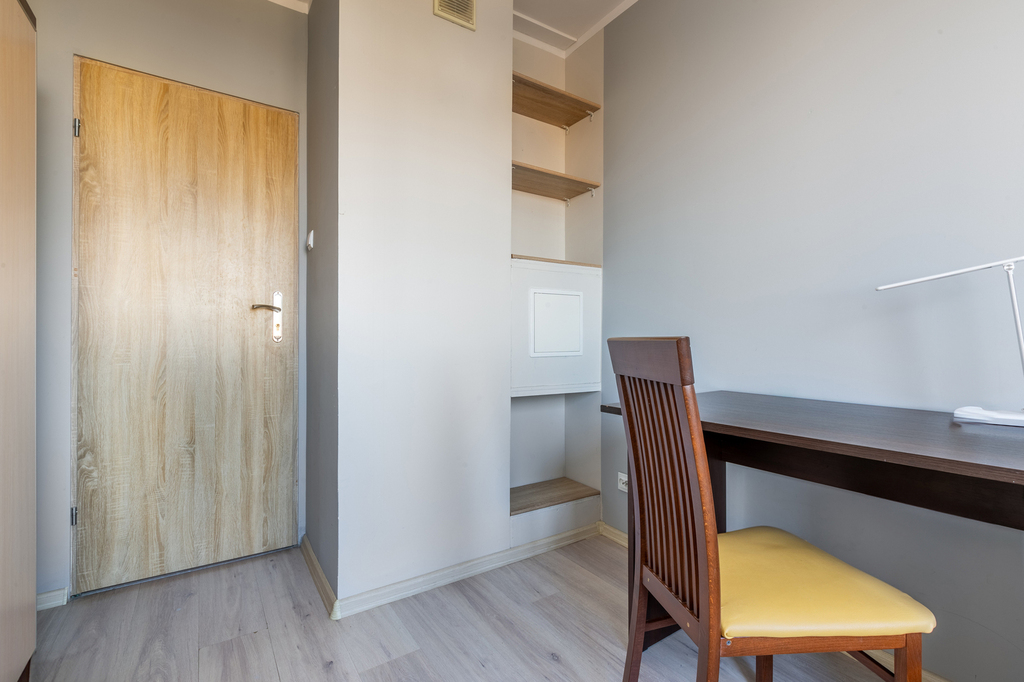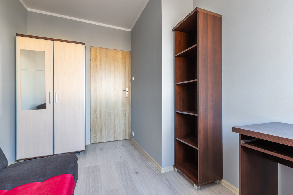 Mieszkanie jest w pełni wyposażone. W każdym z pokoi znajduje się biurko z krzesłem, łóżko i przynajmniej jedna duża szafa. W kuchni płyta elektryczna, mikrofala, lodówka. W łazience pralka.