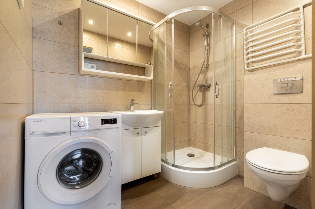 – łazienka z prysznicem i toaletą
