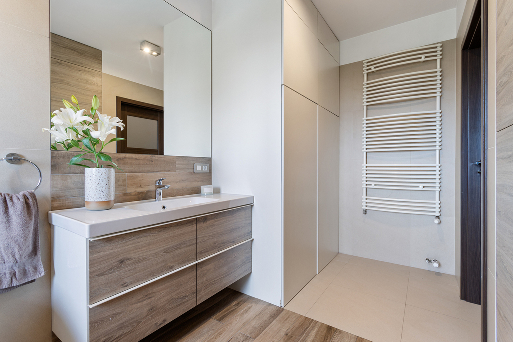 – Łazienka na piętrze z zabudową meblową, dużą kabiną prysznicową oraz wanną. Dodatkowo pralka i suszarka.