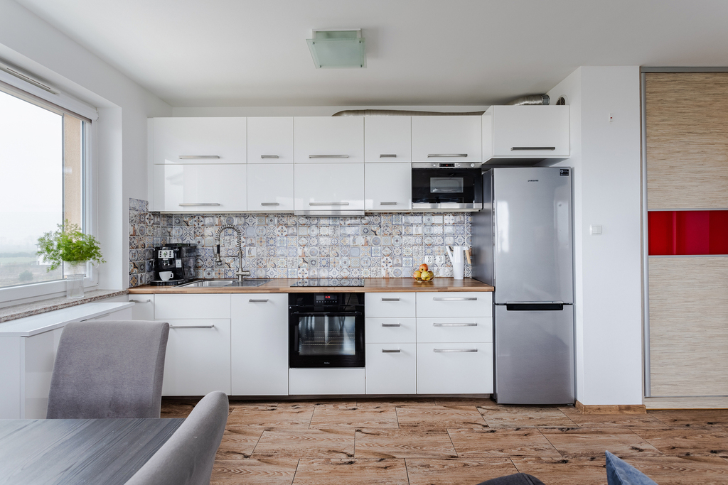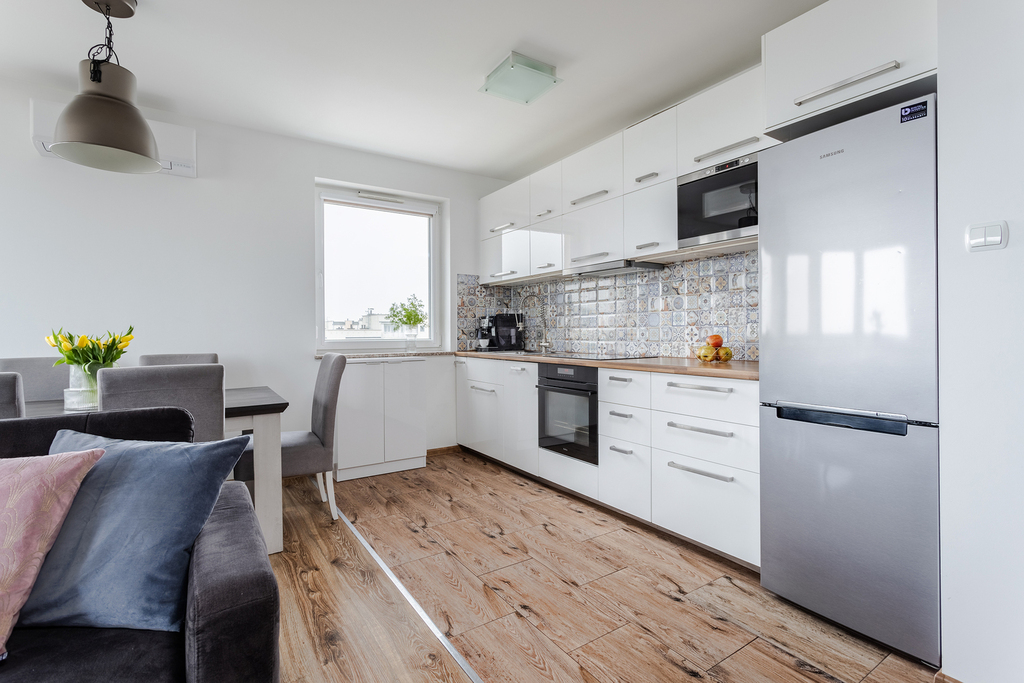W aneksie kuchennym znajdują się meble na wymiar, z płytą indukcyjną oraz zabudowaną mikrofalą, piekarnikiem i zmywarką. Lodówka wolnostojąca.