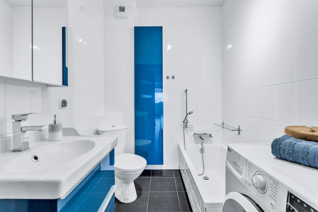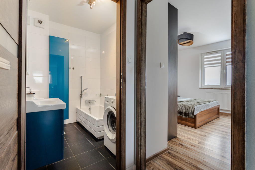 W łazience oprócz umywalki i WC znajdziecie Państwo pralkę oraz małą, kompaktową wannę, którą w bardzo łatwy sposób można zabudować tworząc tym samym duży i komfortowy prysznic.