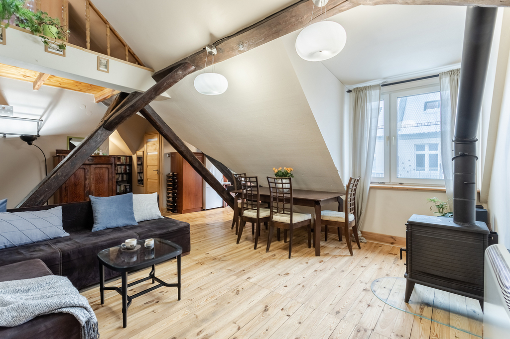Oferujemy do sprzedaży klimatyczne, dwupoziomowe mieszkanie w odnowionej kamienicy przy ulicy Karwowskiego o powierzchni ok 76 m2 (po podłodze ponad 100m2!).