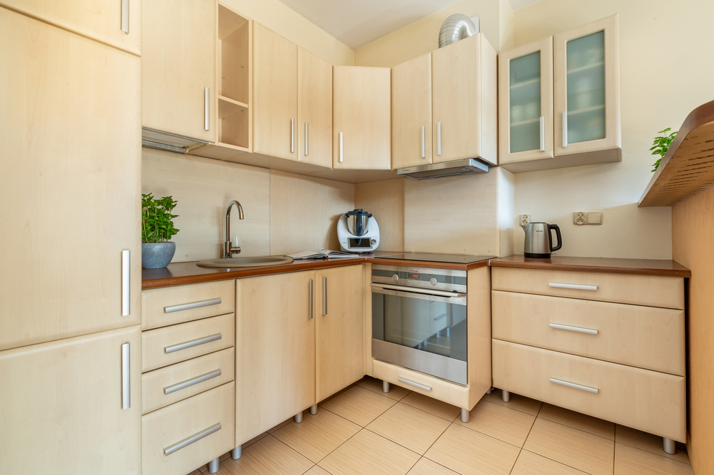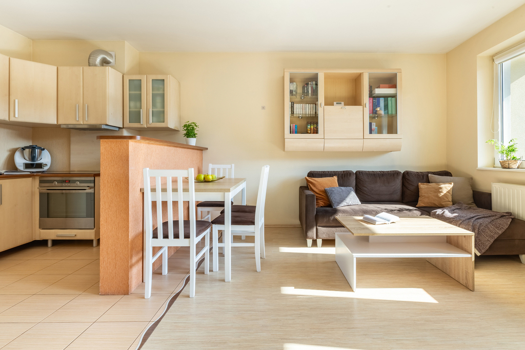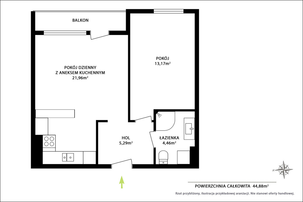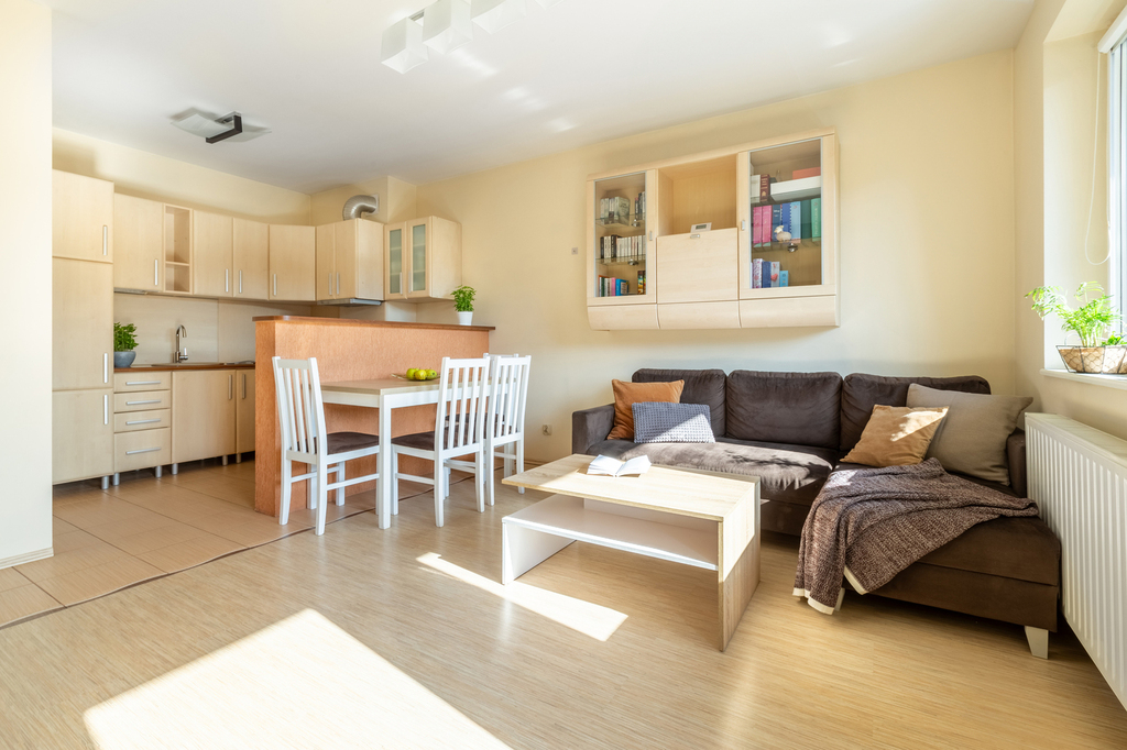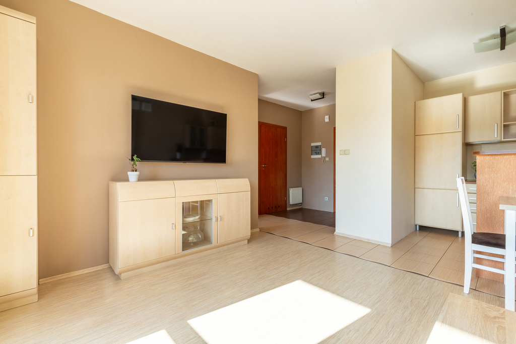 – salon z aneksem kuchennym z wyjściem na balkon (21,96m2)