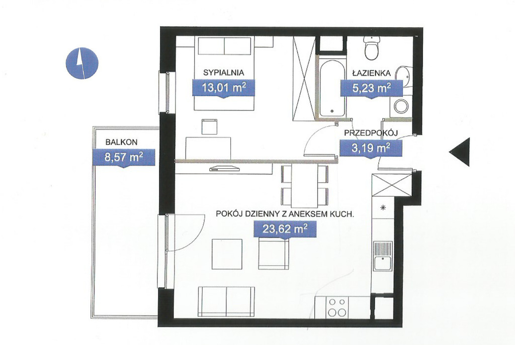 Składa się z przedsionka, łazienki, sypialni oraz pokoju dziennego z aneksem kuchennym.