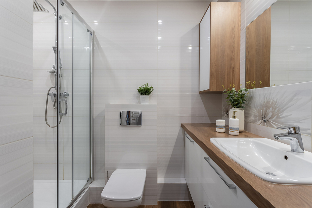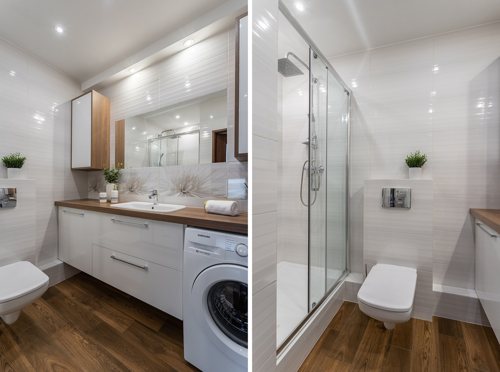 -łazienka z toaletą, umywalką, dużym prysznicem oraz zabudową meblową na wymiar;