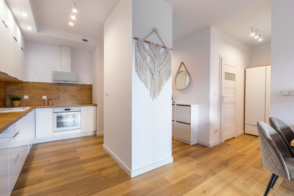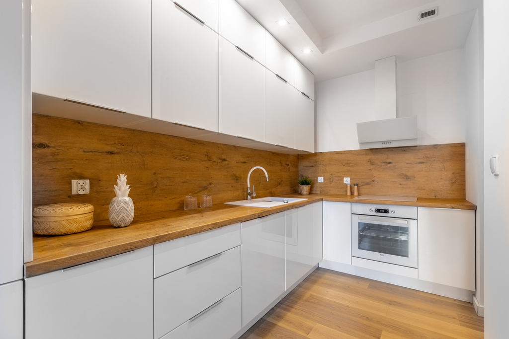 Kuchnia w zabudowie na wymiar w pełni wyposażona w sprzęt AGD ( lodówka, płyta indukcyjna, okap, piekarnik ).