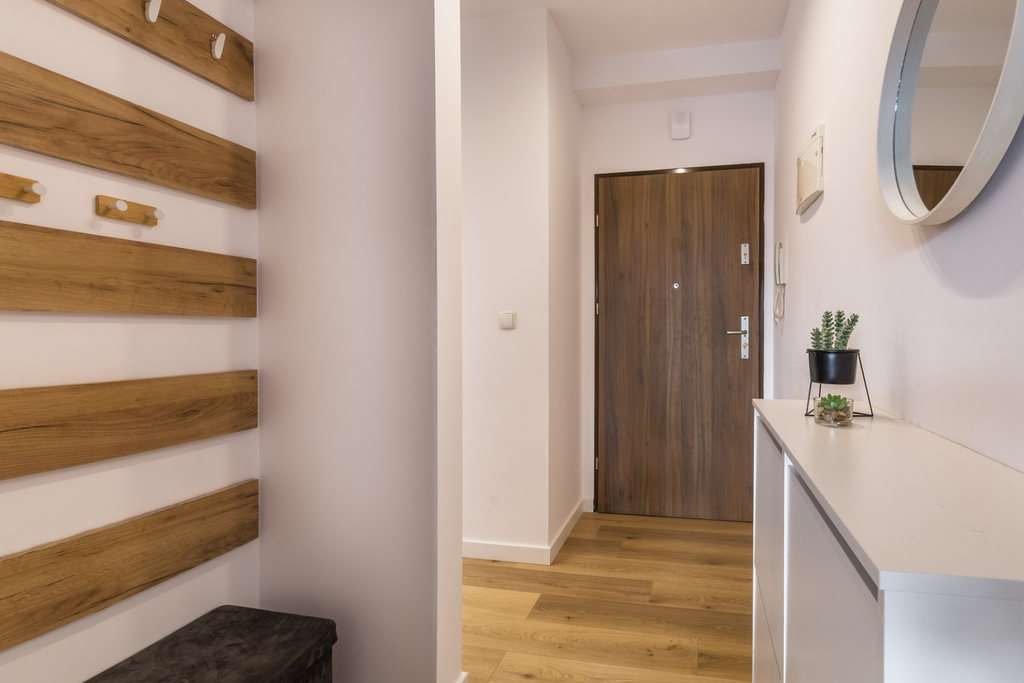 Mieszkanie znajduje się na parterze i jest wyposażone w rolety zewnętrzne oraz wewnętrzne.