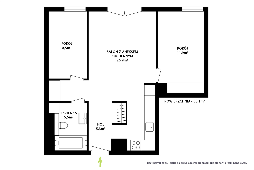 Na powierzchnię mieszkania – 58.1 m2 składa się: