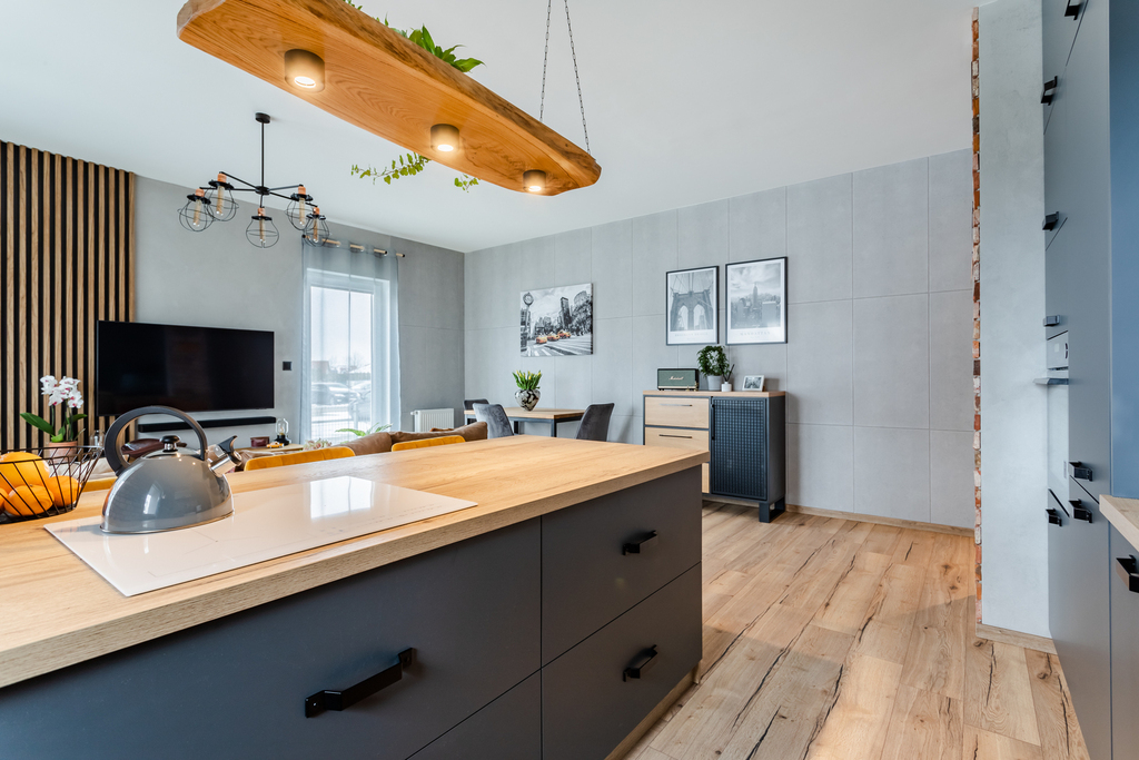 – kuchni na zamówienie wyposażonej w markowy sprzęt AGD ( lodówka, zmywarka, płyta grzewcza, piekarnik parowy w zabudowie oraz mikrofalówka w szafie )