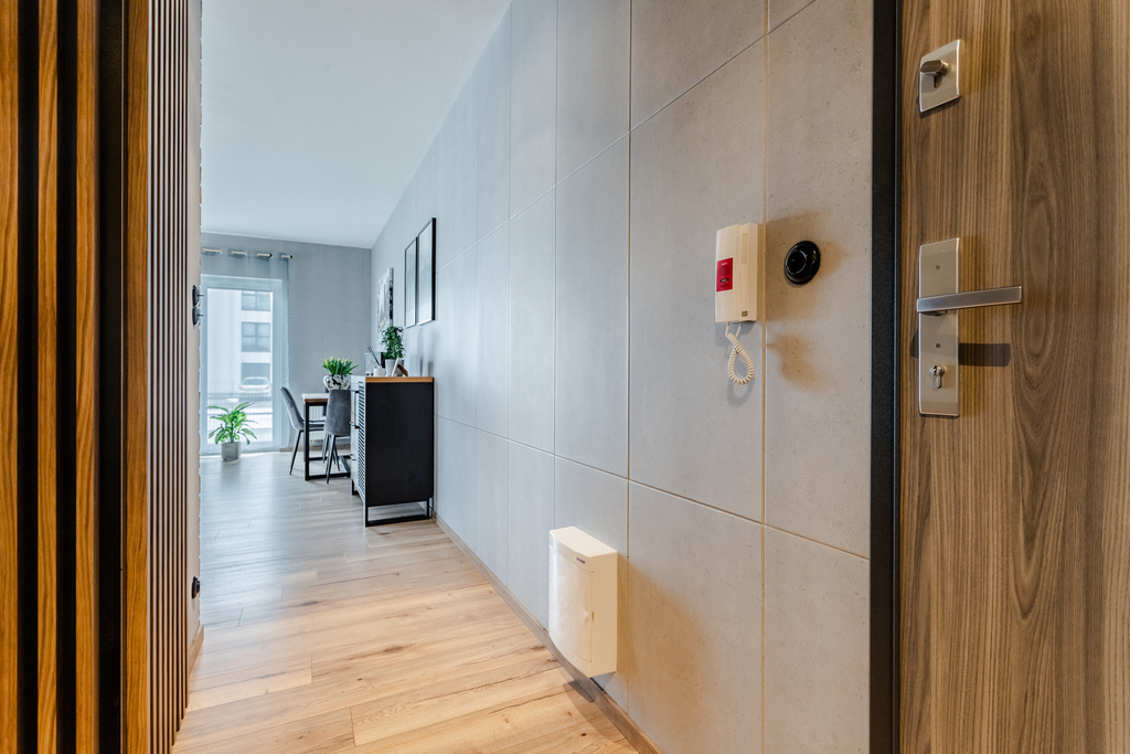 Mieszkanie w pełni umeblowane i gotowe do zamieszkania. Posiada podłogę wyłożoną panelami wysokiej klasy. Na korytarzu zamontowana szafa w formie garderoby. We wszystkich oknach rolety zewnętrzne automatyczne.