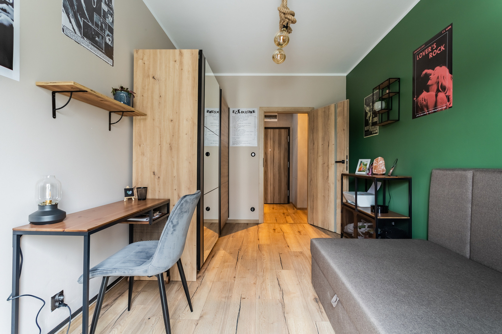 – pokojuz kanapą, biurkiem oraz pojemną szafą z lustrami