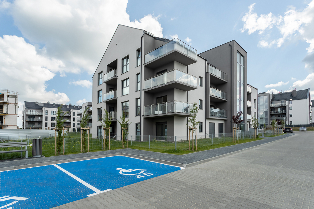 Nowe osiedle z oświetleniem, drogą z kostki brukowej oraz dużą ilością miejsc postojowych.