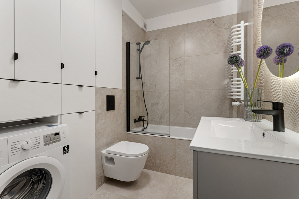 – zabudowa szafy w łazience wykonana na wymiar przez stolarza,