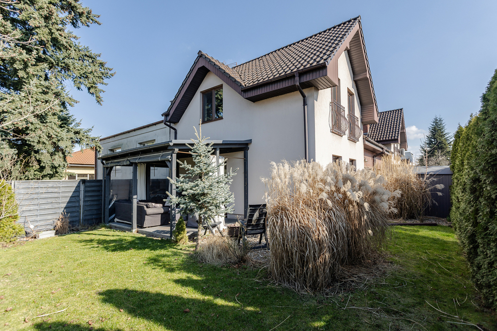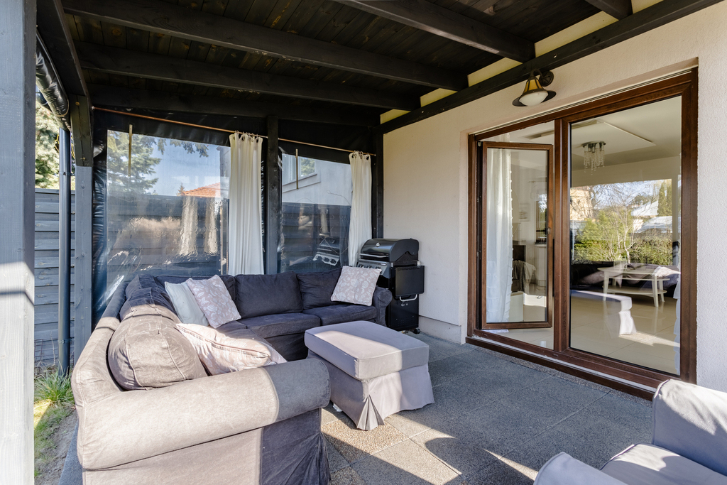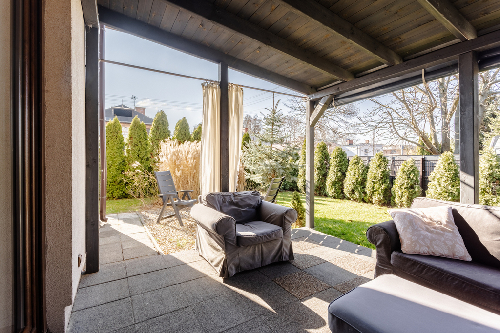 Powierzchnia ok. 120 m² z zadbaną trawą, zadaszonym tarasem i miejscem na grill. Naturalne ogrodzenie z drzew zapewnia prywatność i intymność.