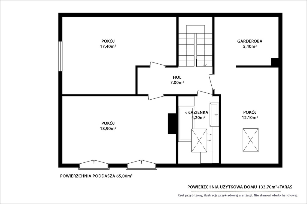 • dodatkowo poddasze z możliwością wykończenia i własnej aranżacji (niewliczone w metraż)