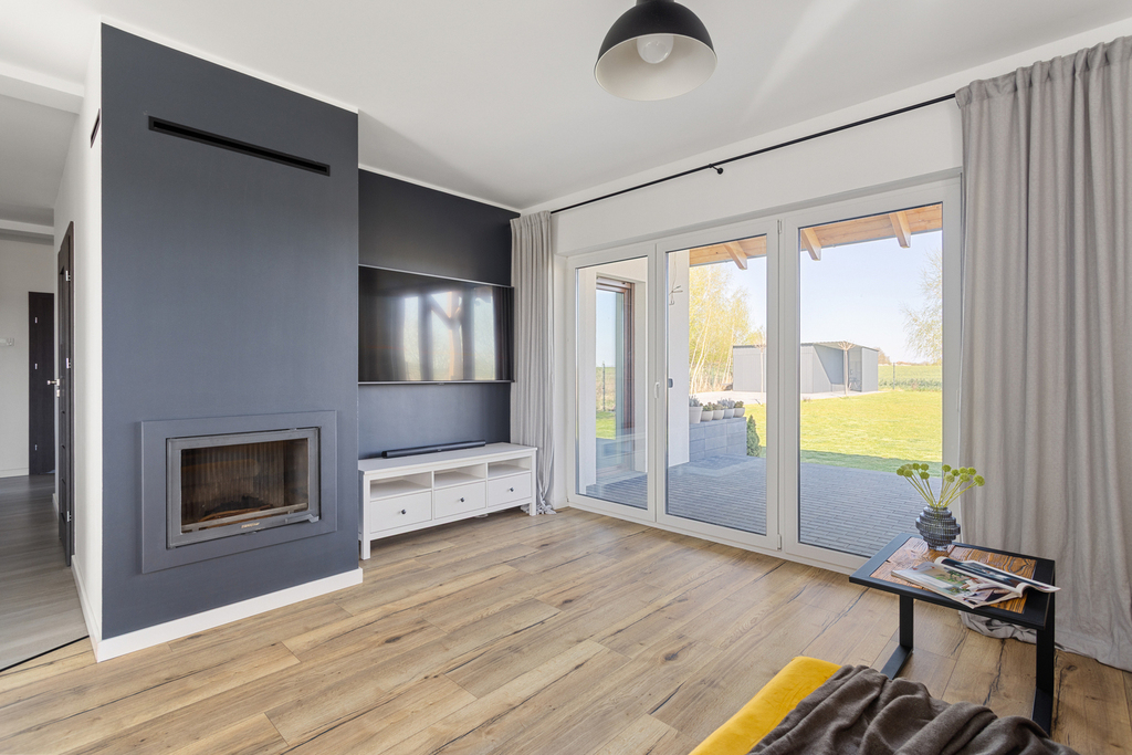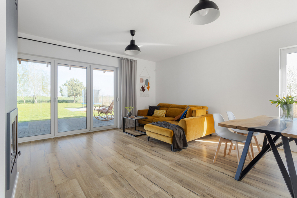 – Przestronny salon (27,71 m²) z dużymi drzwiami tarasowymi i pięknym widokiem na ogród