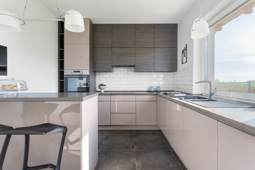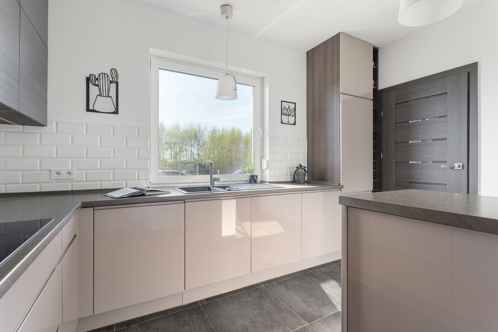 Kuchnia umeblowana i w pełni wyposażona (lodówka, piekarnik, płyta indukcyjna, zmywarka, systemy Blum), dodatkowo praktyczna spiżarnia.