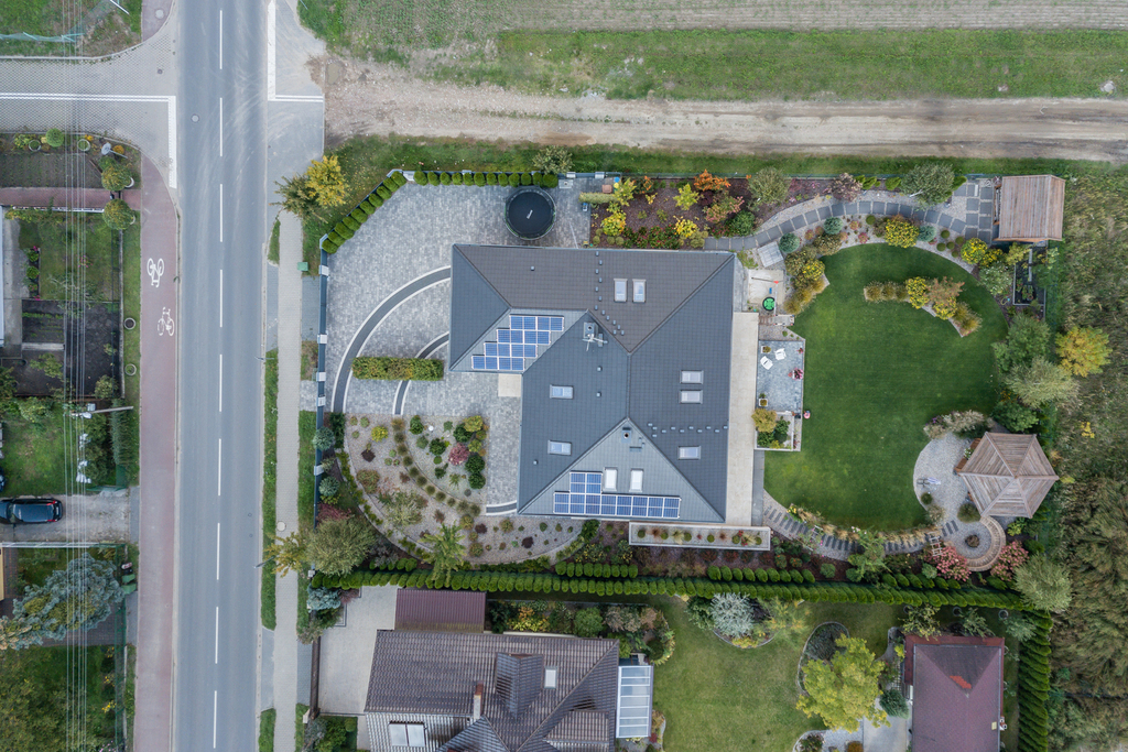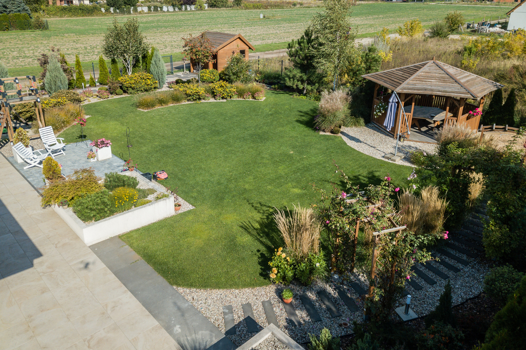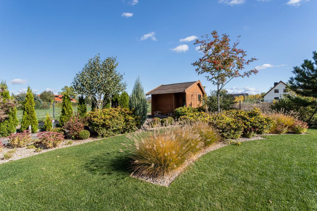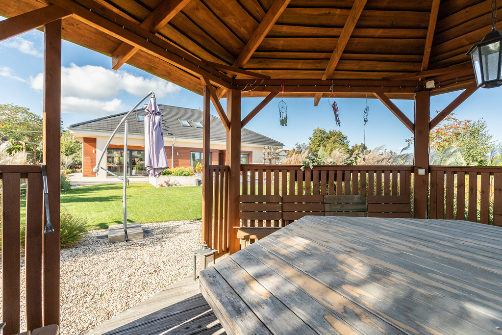 Ogromnym atutem jest piękny, duży ogród zaprojektowany przez firmę. Ogród z bogatą roślinnością , automatycznym systemem nawadniania , altaną , miejscem na ogniska i domkiem gospodarczym.