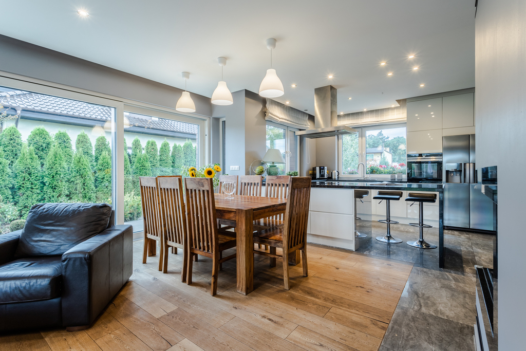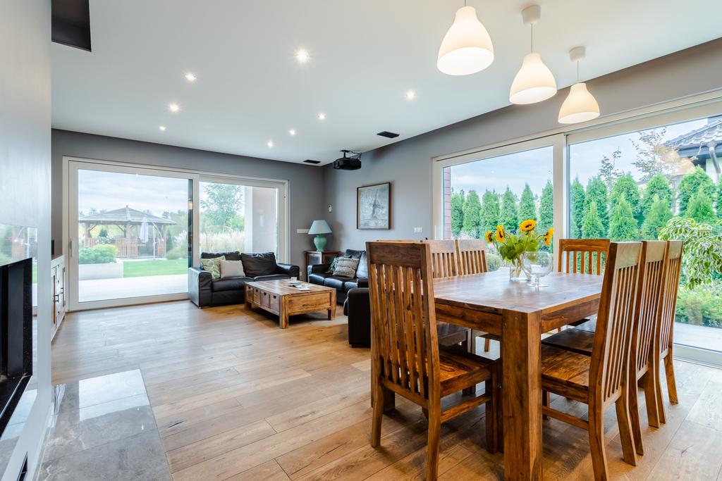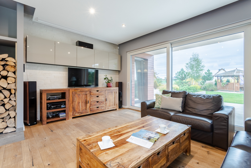 – duży salon ( ok 32 m2 ) z wyjściem na taras i ogród poprzez duże rozsuwane drzwi ( zarówno od strony ogrodu jak i z boku domu )