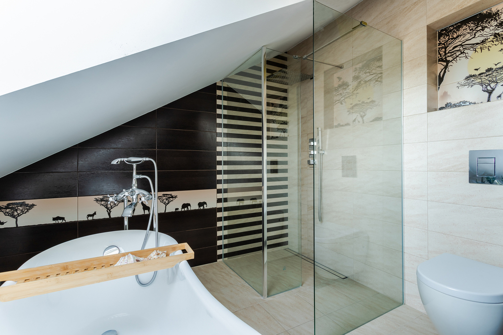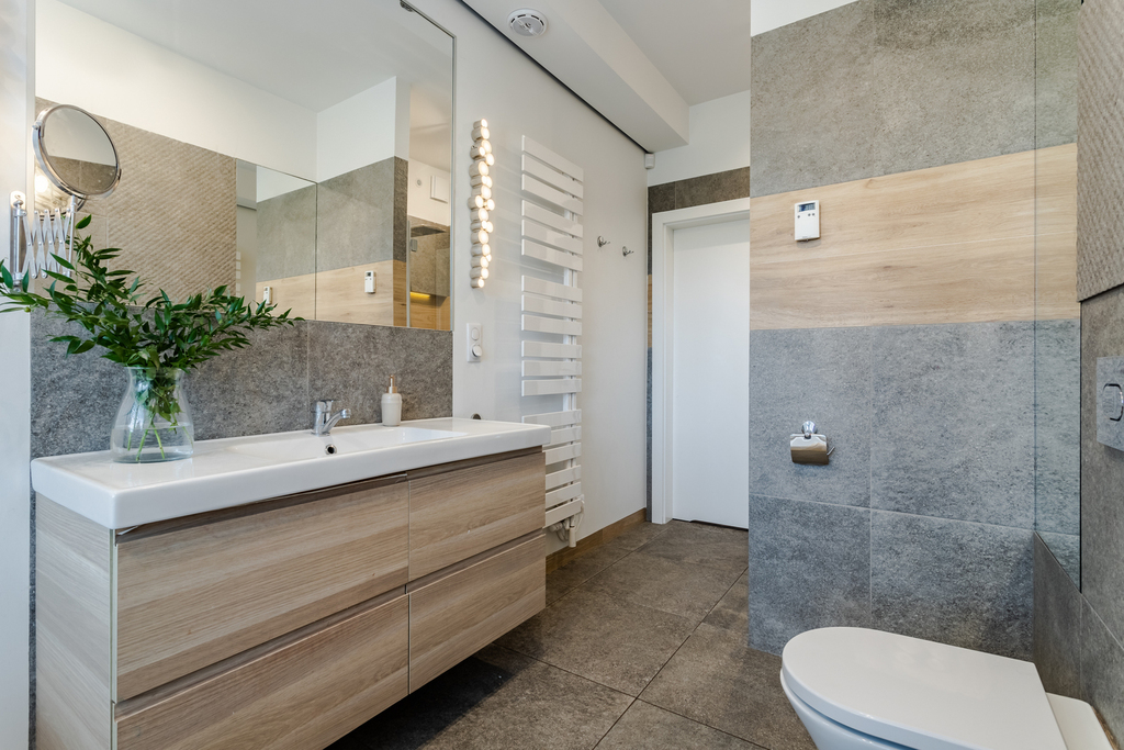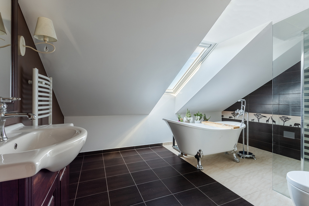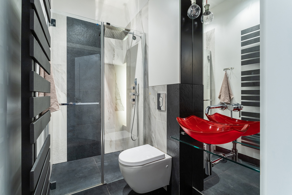 – łazienka z toaletą, umywalką, wanną i prysznicem typu walk-in.