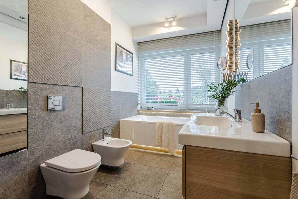 – łazienka ( ok 9,2 m2 ) z prysznicem typu walk-in , umywalką , toaletą, bidetem i wanną .