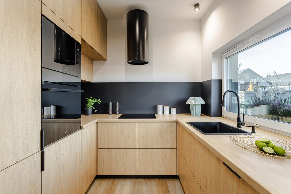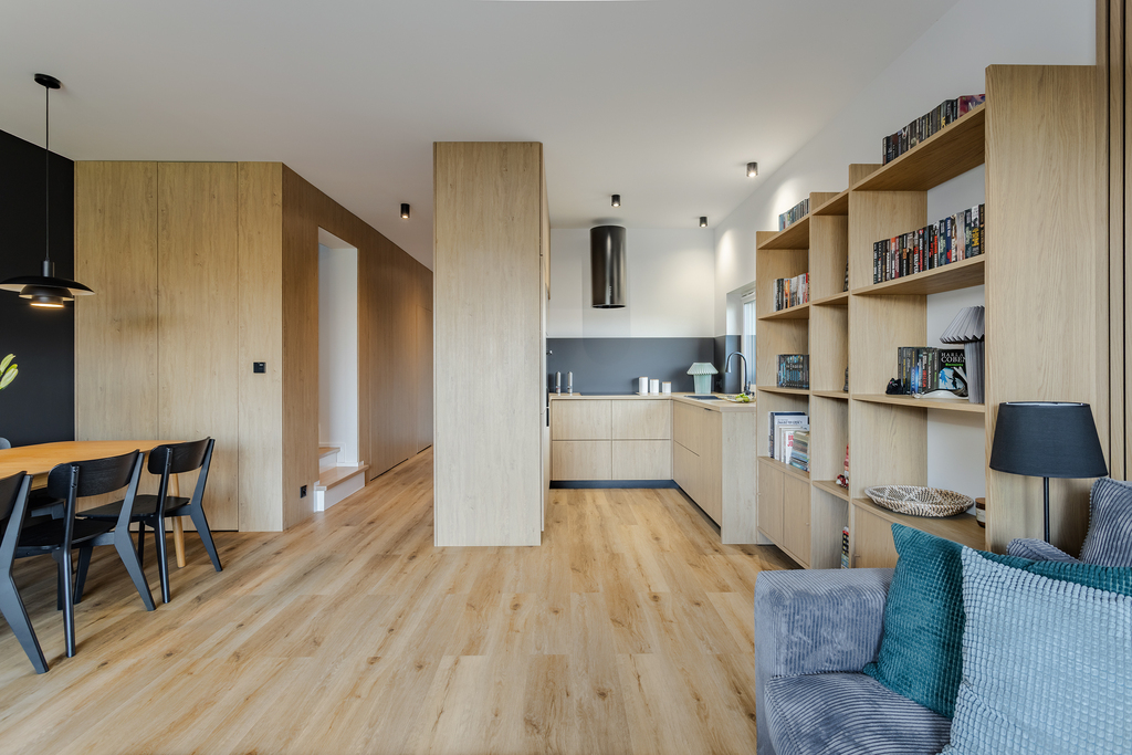 - kuchnia w pełnej zabudowie stolarskiej (systemy BLUM, sprzęt AGD w zabudowie: lodówka, zmywarka, piekarnik, mikrofalówka, płyta indukcyjna, okap – wszystko na gwarancji),