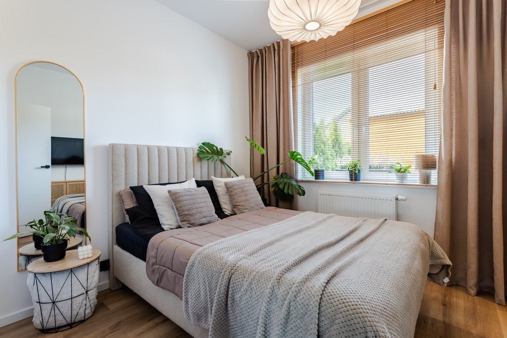 - dwie sypialnie (w tym główna z łóżkiem 180×200 cm); główna sypialnia z dodatkowym wyciszeniem ściany wspólnej