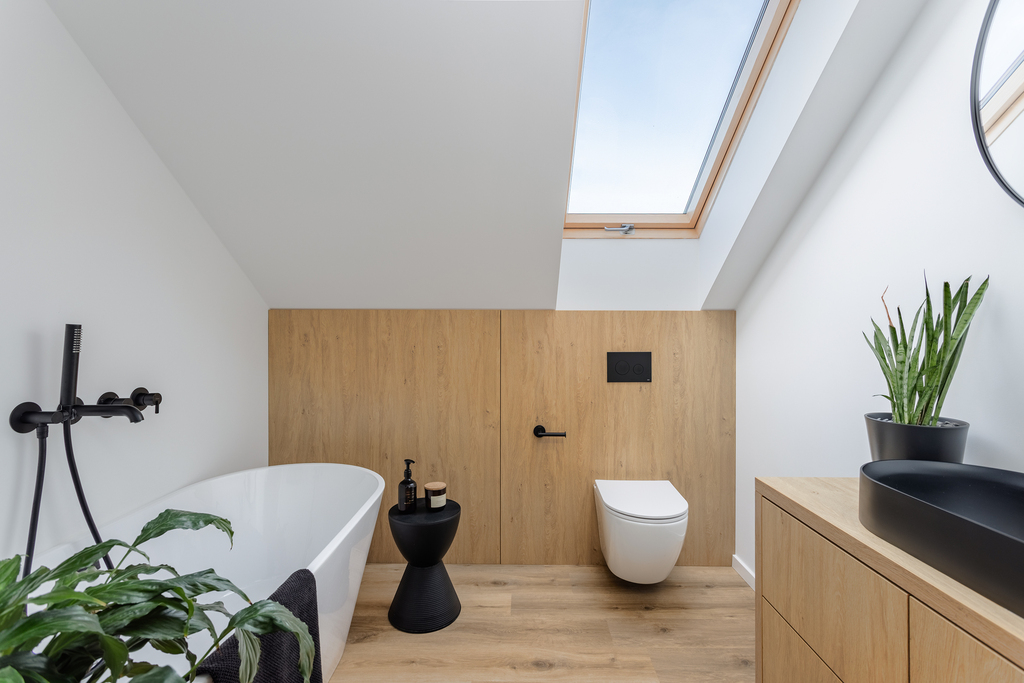 - łazienka z wanną wolnostojącą (baterie DEANTE, szafki z okuciami BLUM),