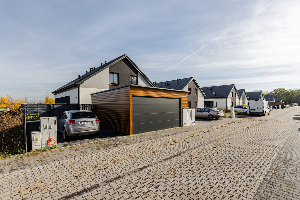 Dom posiada własny dwustanowiskowy garaż z automatyczną bramą wraz z miejscem na regały oraz rowery. Dodatkowo jest wykonane trzecie miejsce postojowe.