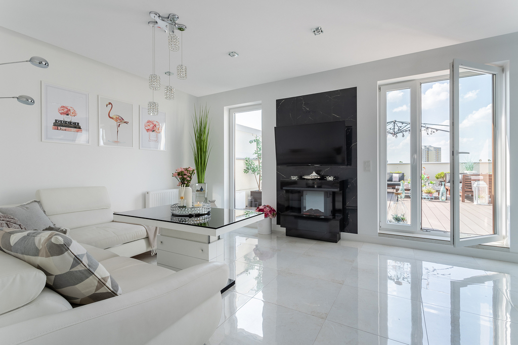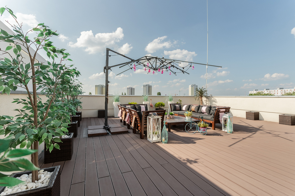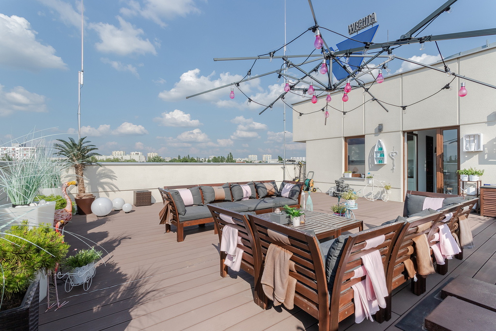 – ogromny atut – taras 75 m2 w pełni zagospodarowany między innymi w duży komplet wypoczynkowy. Wieczorami można podziwiać niesamowity zachód słońca.
