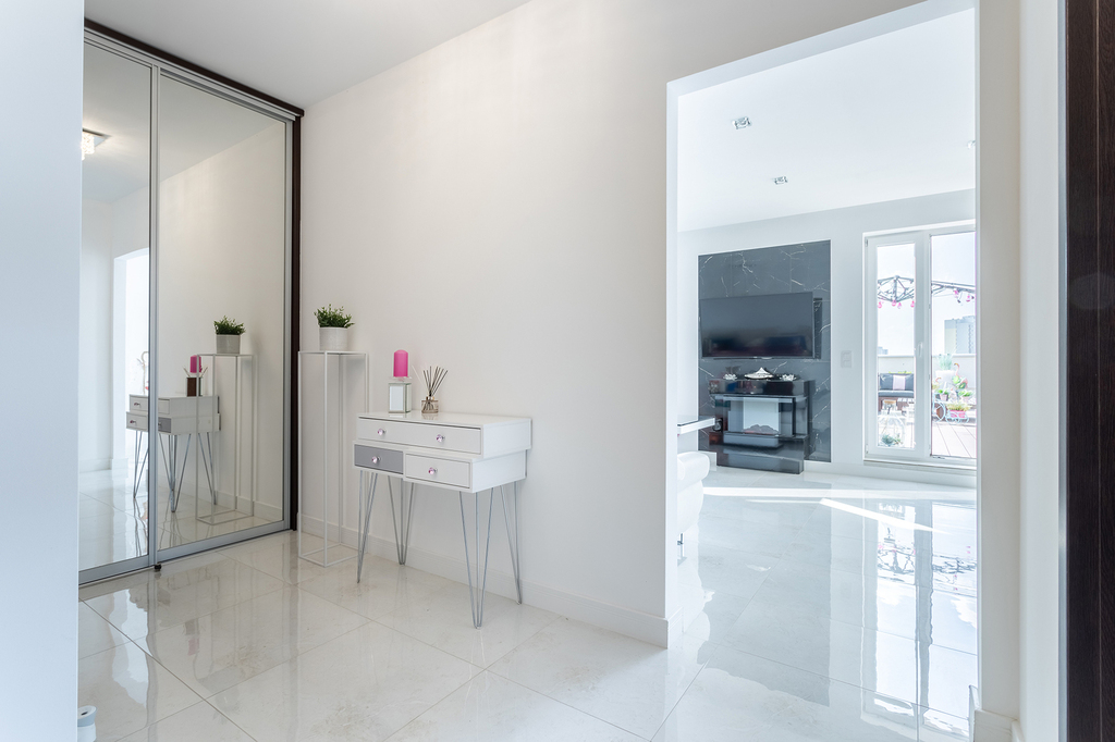 – korytarz z zabudową 2 szaf na wymiar ( w pierwszej zabudowana jest między innymi pralka ) , druga szafa z lustrem )