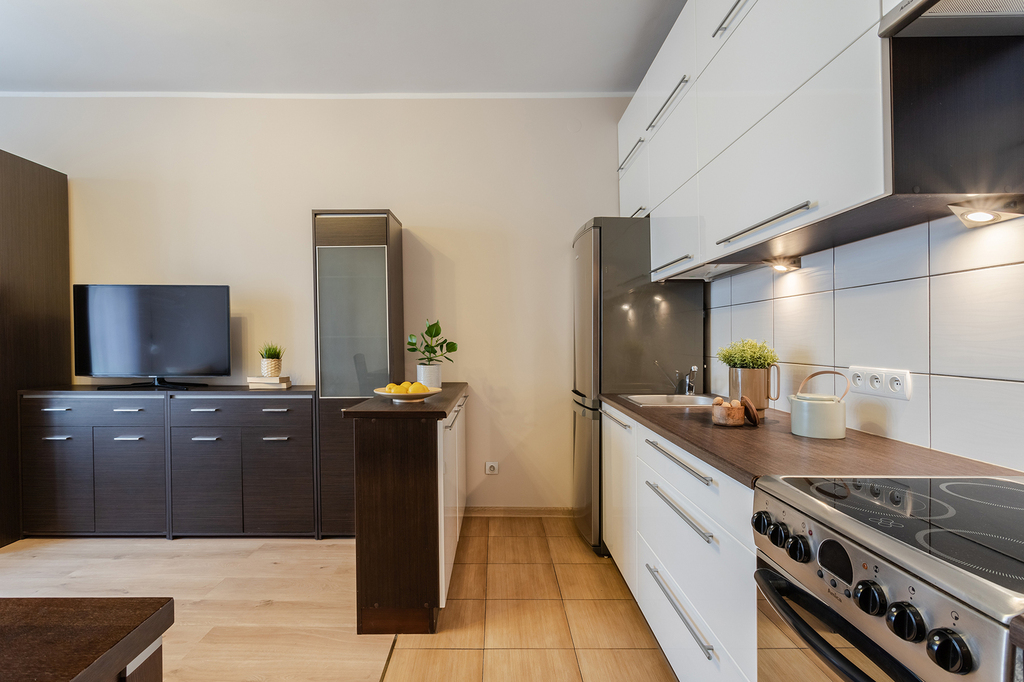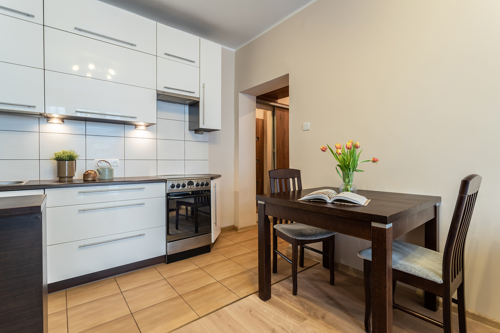 W ramach wspomnianego wyposażenia w mieszkaniu pozostają wszystkie meble widoczne na zdjęciach oraz sprzęty RTV (telewizor, kino domowe), a także AGD (kuchenka, nowa lodówka, pralka). Należy również odnotować, iż zabudowa kuchenna została wykonana przez stolarza na wymiar.
