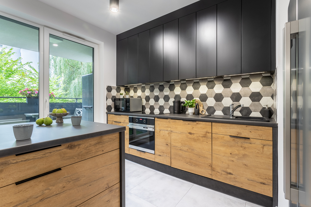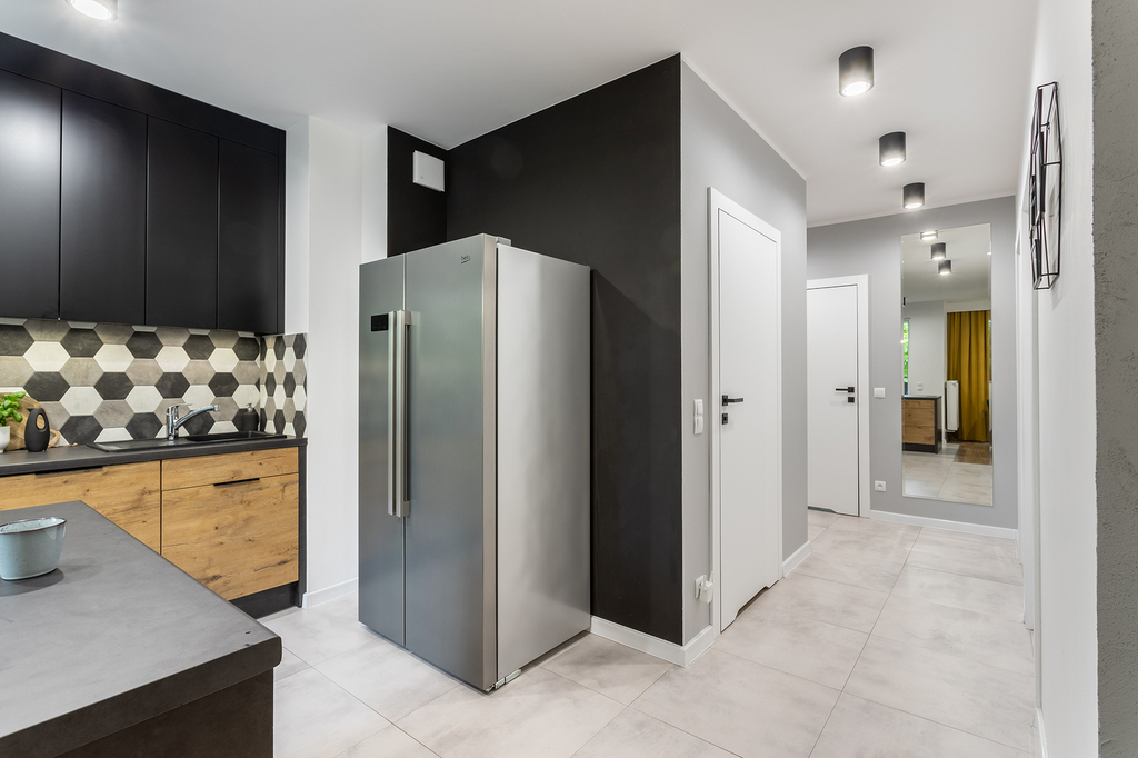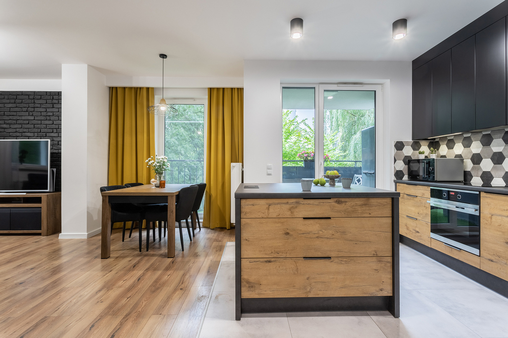 -salon ekspozycja północno-zachodnia oraz północno-wschodnia (27m2) z wyjściem na loggię (4,70m2) oraz z aneksem kuchennym (aneks w pełni wyposażony w sprzęt AGD, piekarnik, płyta grzewcza, lodówka, zmywarka, okap)