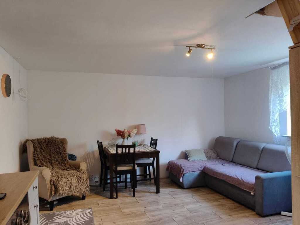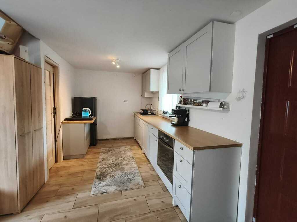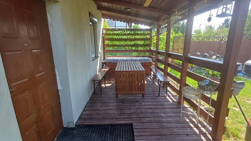 Strefa dzienna z aneksem kuchennym, osobna toaleta. Schowek na narzędzia ogrodnicze.