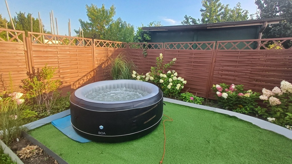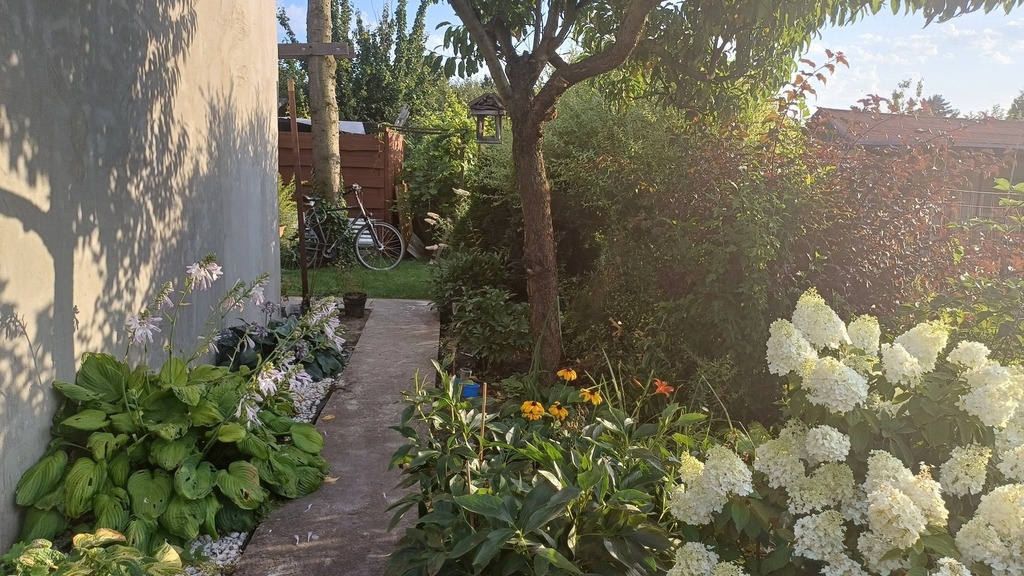 Wyposażenie i narzędzia ogrodowe w cenie (bez jacuzzi). Nasadzenia składające się z drzew i krzewów owocowych oraz roślin ozdobnych.