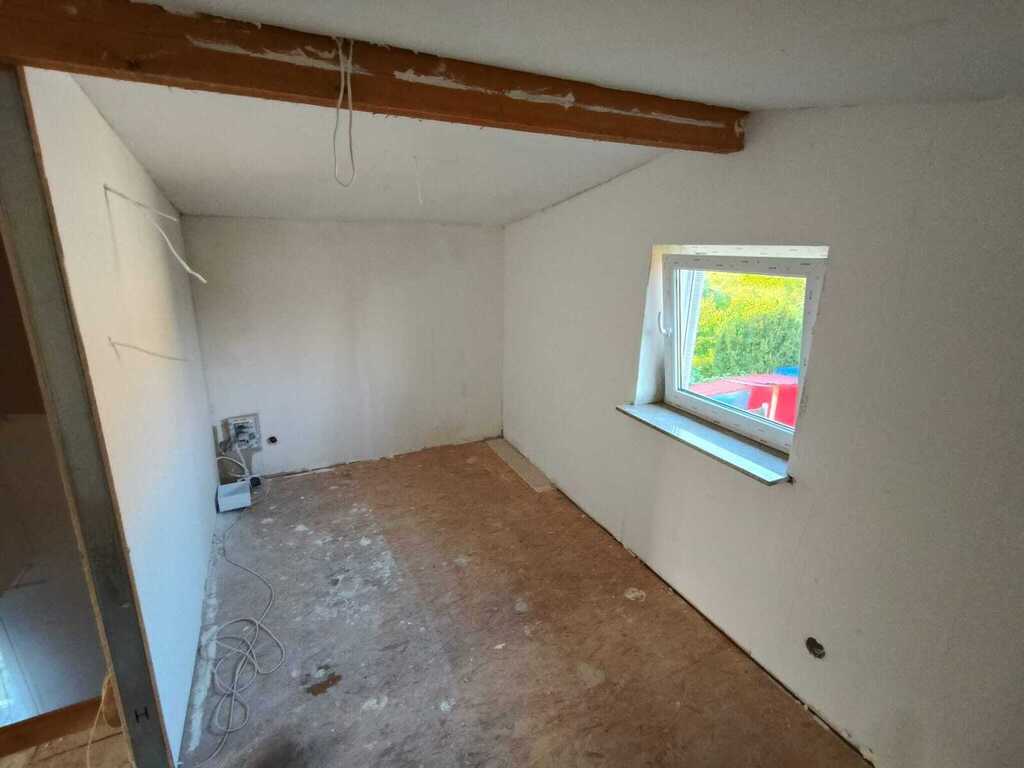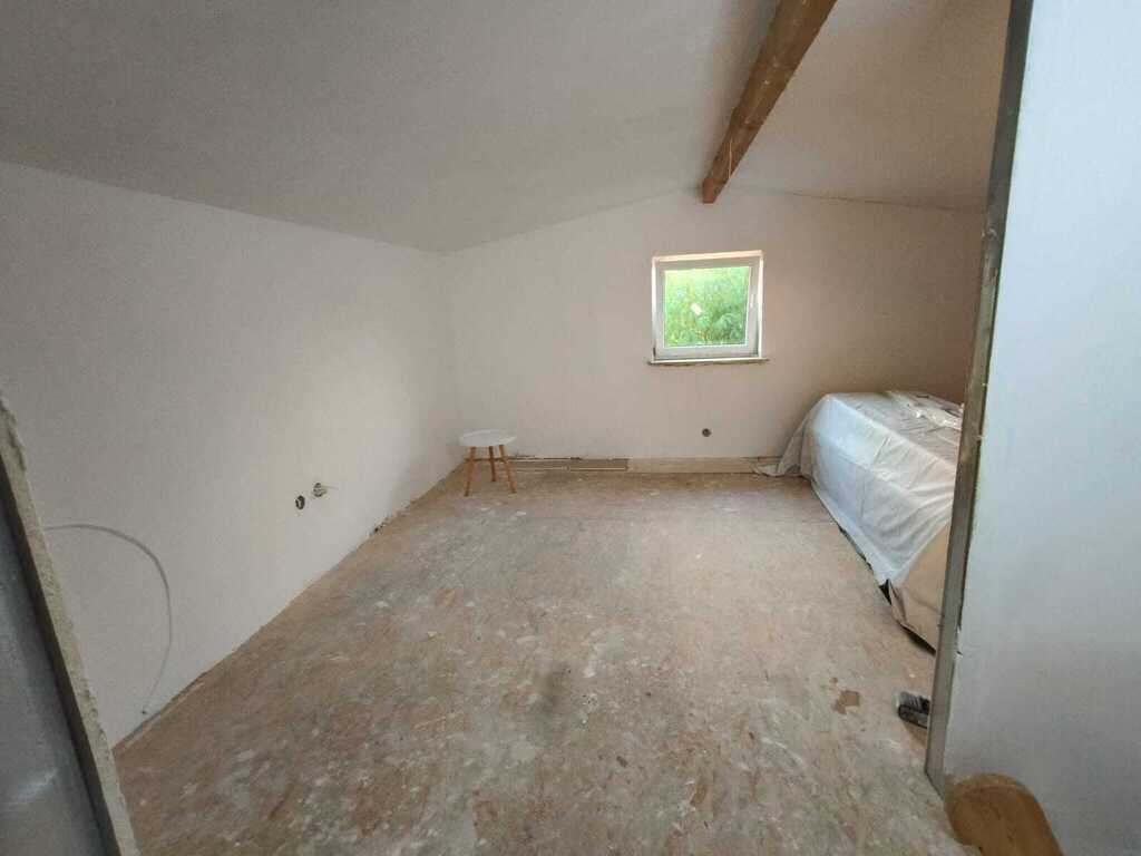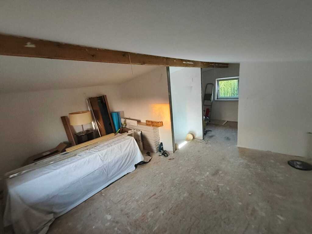 Górna część domu na piętrze o wysokości do belki około 2,07m daje swobodną możliwość przemieszczania. Dwa dodatkowe pokoje w górnej części z oknami – do wykończenia.