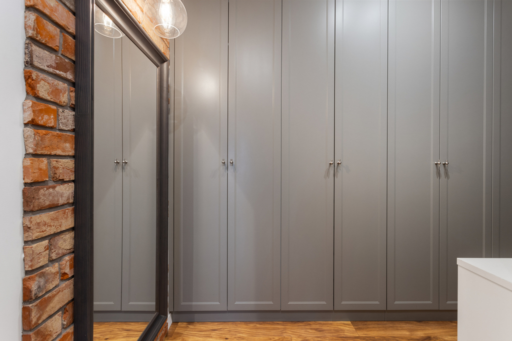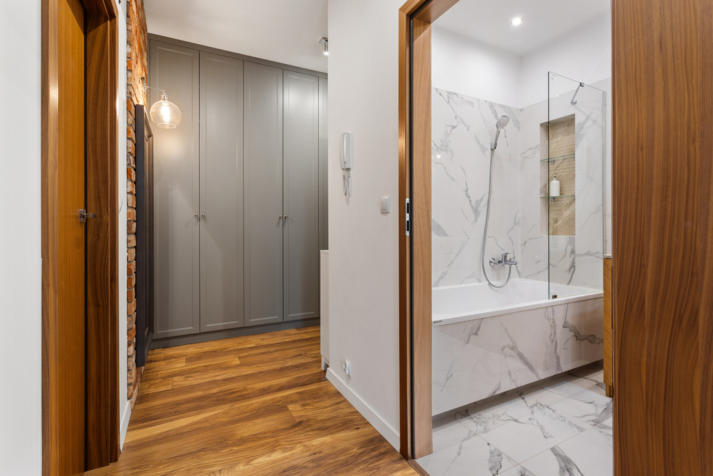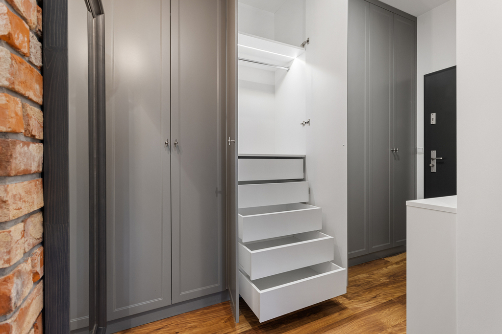 – kuchnia, łazienka i garderoba w przedpokoju na wymiar – meble z wewnętrznym oświetleniem i okuciami blum.