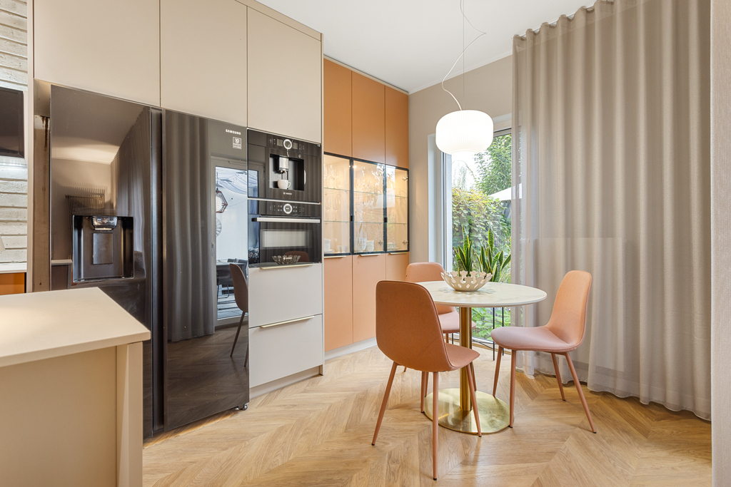 (kuchenka indukcyjna, duża lodówka, piekarnik i ekspres do kawy w zabudowie)