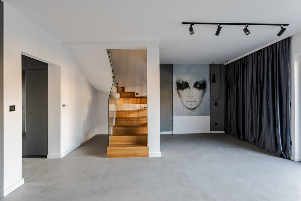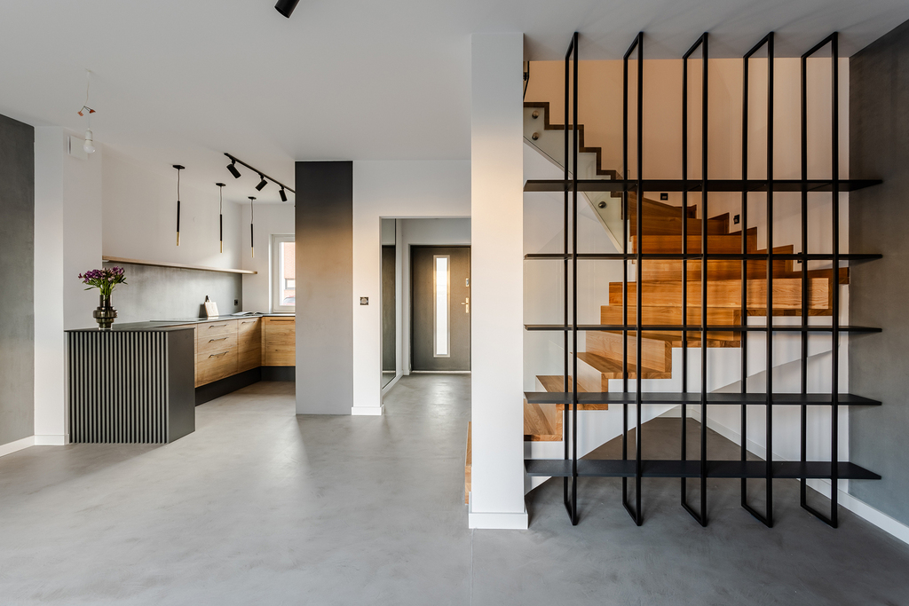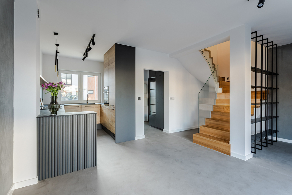 Dom wykończony nie pod sprzedaż a dla siebie, z bardzo wysokiej klasy materiałów, z pełną dbałością o detale. Ściany – beton strukturalny oraz gładź gipsowa. Podłoga – wysokiej jakości panele, płytki oraz mikrocement. Wysokość pomieszczeń – 266 cm. Dach – dachówka ceramiczna + podwójna wełna mineralna + folia paroizolacyjna. Poddasze jest bardzo dobrze ocieplone, doprowadzone zostało ogrzewanie oraz prąd. Kuchnia od stolarza w stanie idealnym, sprzęty wysokiej jakości praktycznie nie używane (piekarnik, duża płyta indukcyjna z okapem, zmywarka, lodówka). W łazience na parterze, dzięki przemyślanej aranżacji, zmieścił się piec dwufunkcyjny, zmiękczacz do wody oraz pralkosuszarka. Schody wykończone drewnem, stalą i przeszkleniami, dają efekt bardzo otwartej i jasnej klatki schodowe.